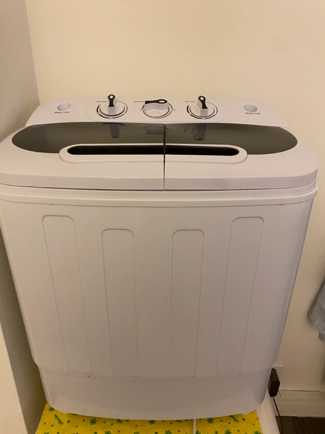 This is a compact twin tub washing machine. It features separate tubs for washing and spinning. The controls include a wash timer, spin timer, and select switch for wash or drain functions.