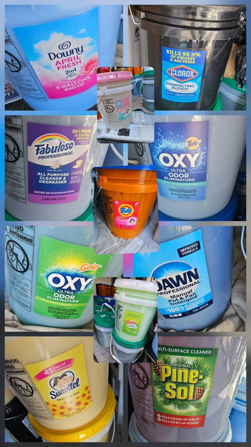 This lot includes several large cleaning product buckets. Items are Downy April Fresh 2-in-1 Fabric Softener, Clorox Disinfecting Bleach, Fabuloso Professional All Purpose Cleaner & Degreaser, Tide Oxy Ultra Odor Eliminators, Gain Oxy Ultra Odor Eliminators, Dawn Professional Manual Pot & Pan Detergent, Suavitel Morning Sun Fabric Softener, and Pine-Sol Multi-Surface Cleaner. Most buckets are 5 gallons.