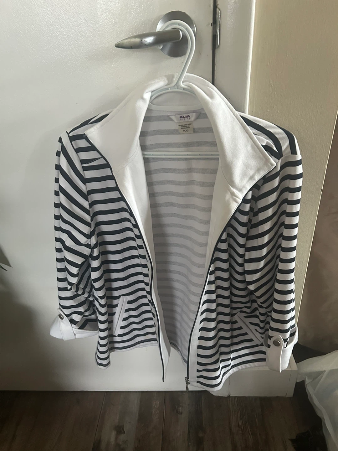 This is an ALIA PETITE women's jacket with a horizontal stripe pattern. It features a full zip closure and a collar. Size is PL/G.