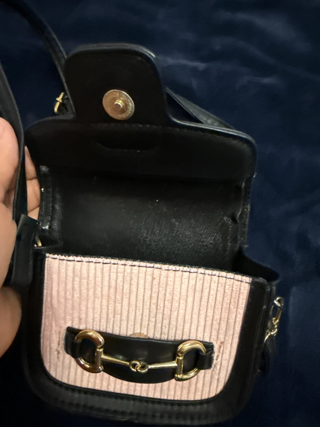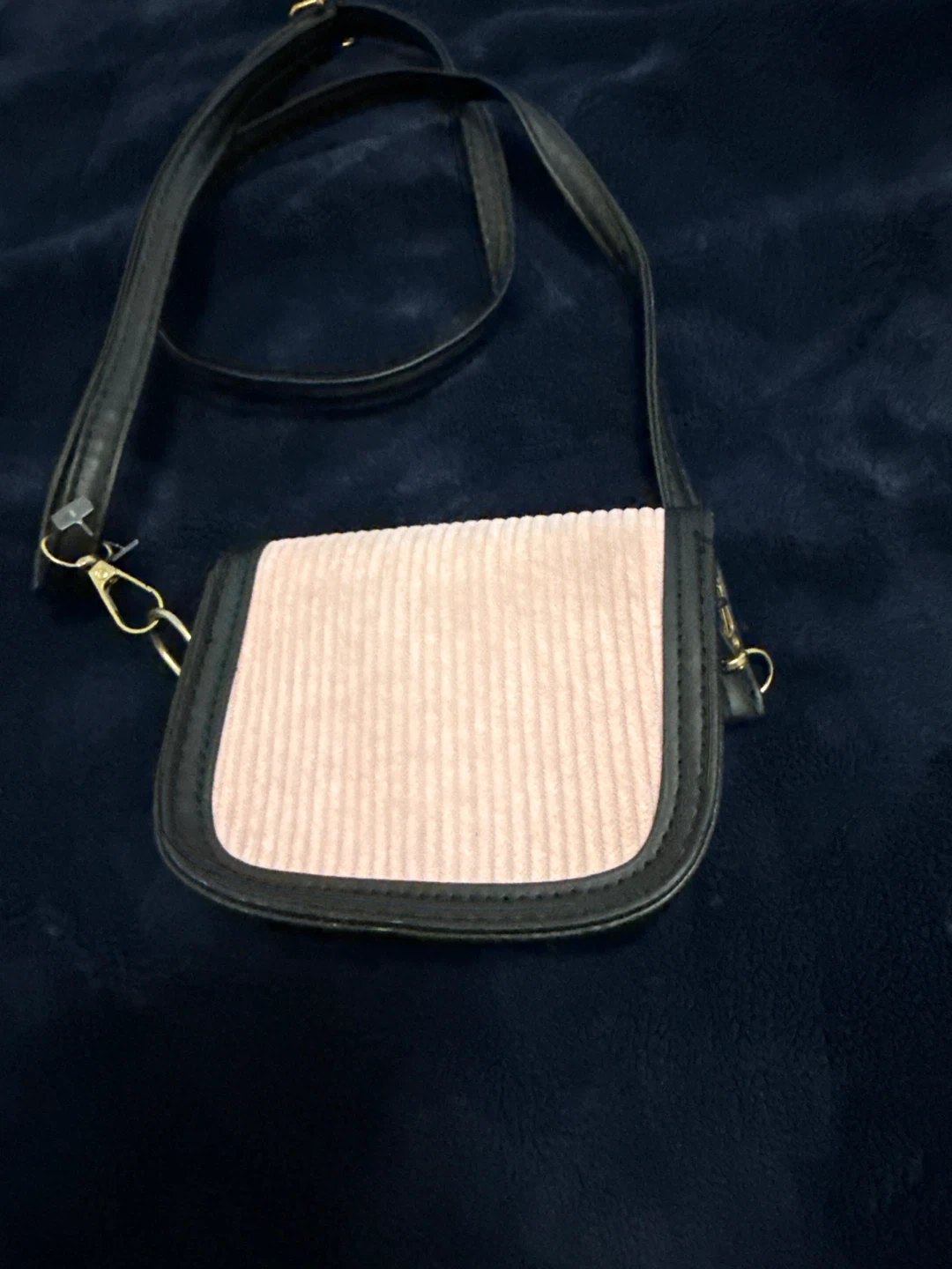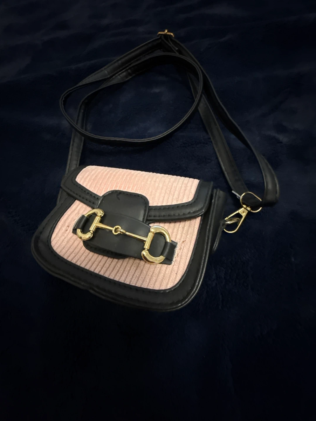 This cute crossbody bag is black with pink corduroy detailing on the front flap. It's got a secure clasp closure and an adjustable strap. Perfect for carrying essentials on the go!