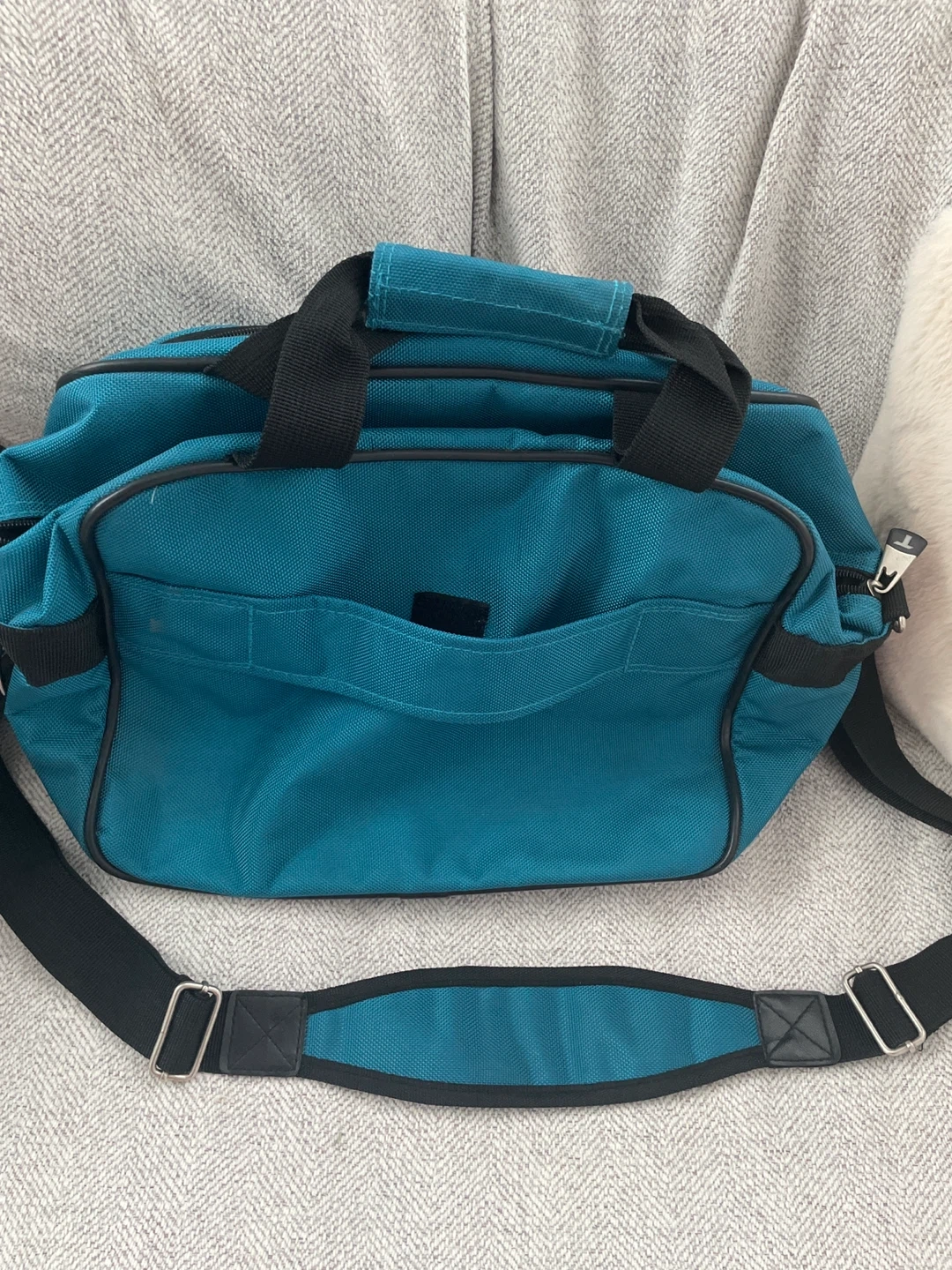 Selling a teal Tracker shoulder bag. It has a strap on the back to slide a suitcase handle through when traveling! It has black straps and silver hardware. Perfect for travel or everyday use.