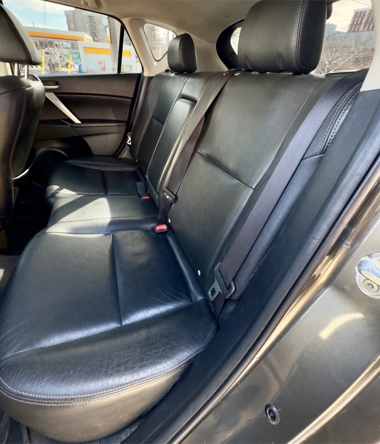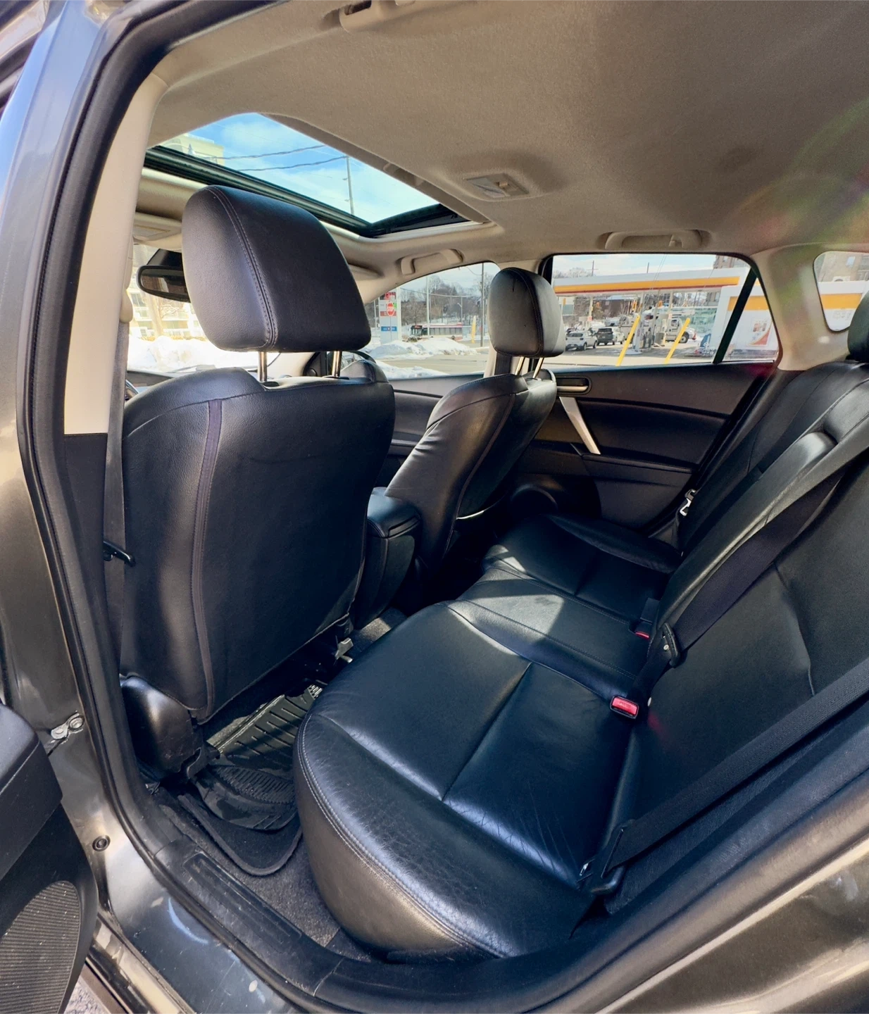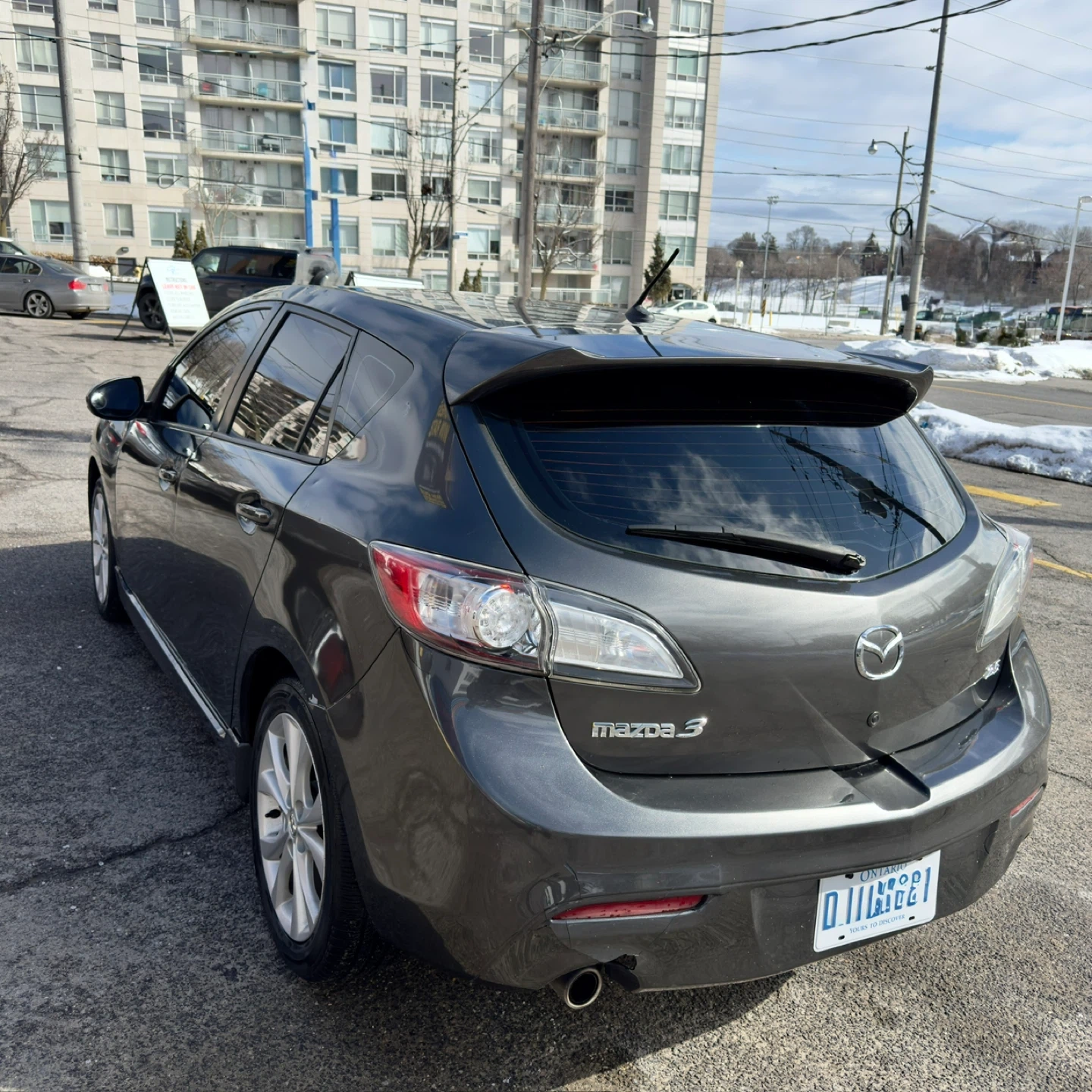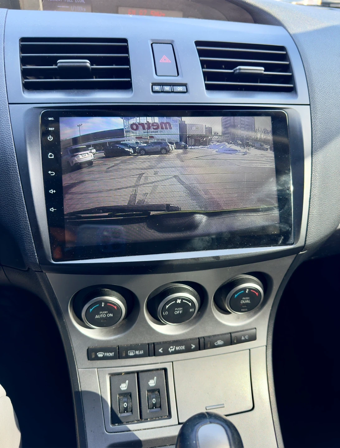 A grey Mazda 3 hatchback with a 2.5L engine. It features a backup camera integrated into the infotainment system. Heated seats are included.