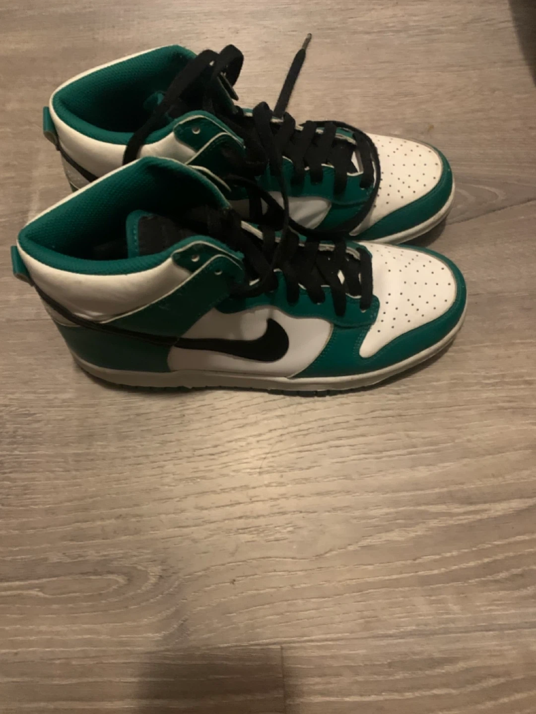 These are Nike Dunk High sneakers in an emerald green and white colorway. They feature a lace-up closure and a high-top design. A classic silhouette for everyday wear! Women’s size 8.5-9 and men’s 7