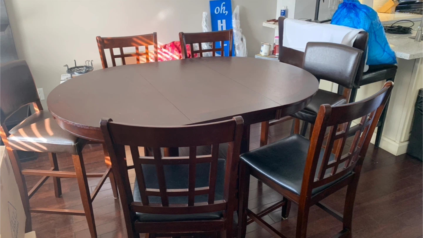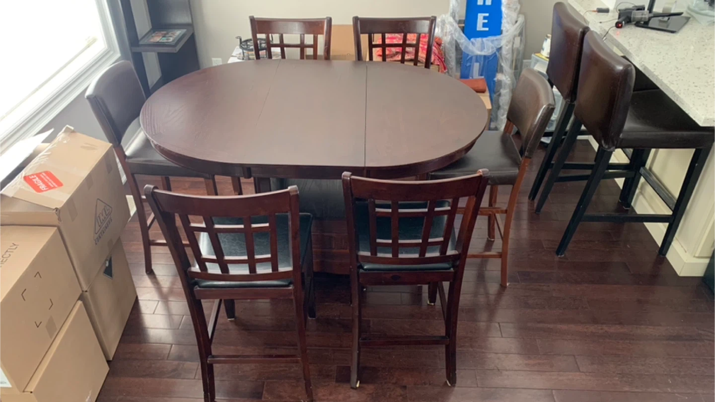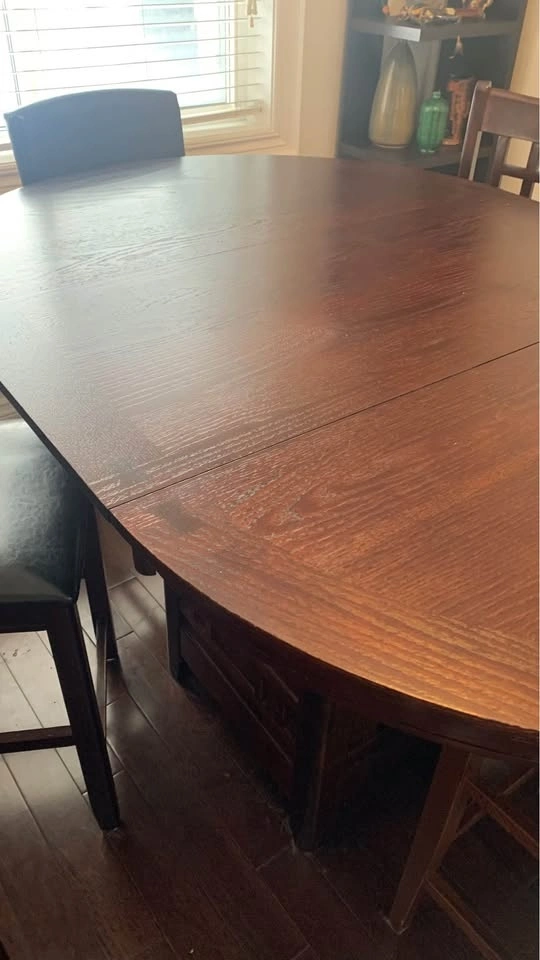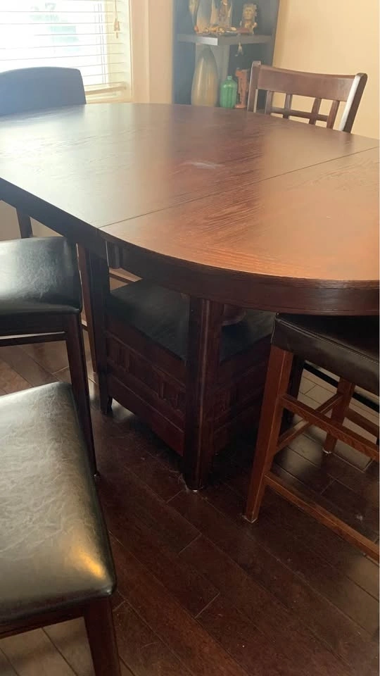 Great condition 7pc Counter-Height Dining Set with 6 chairs. Features a round oak brown table with a 42-60 inch extension. Let me know if you're interested!