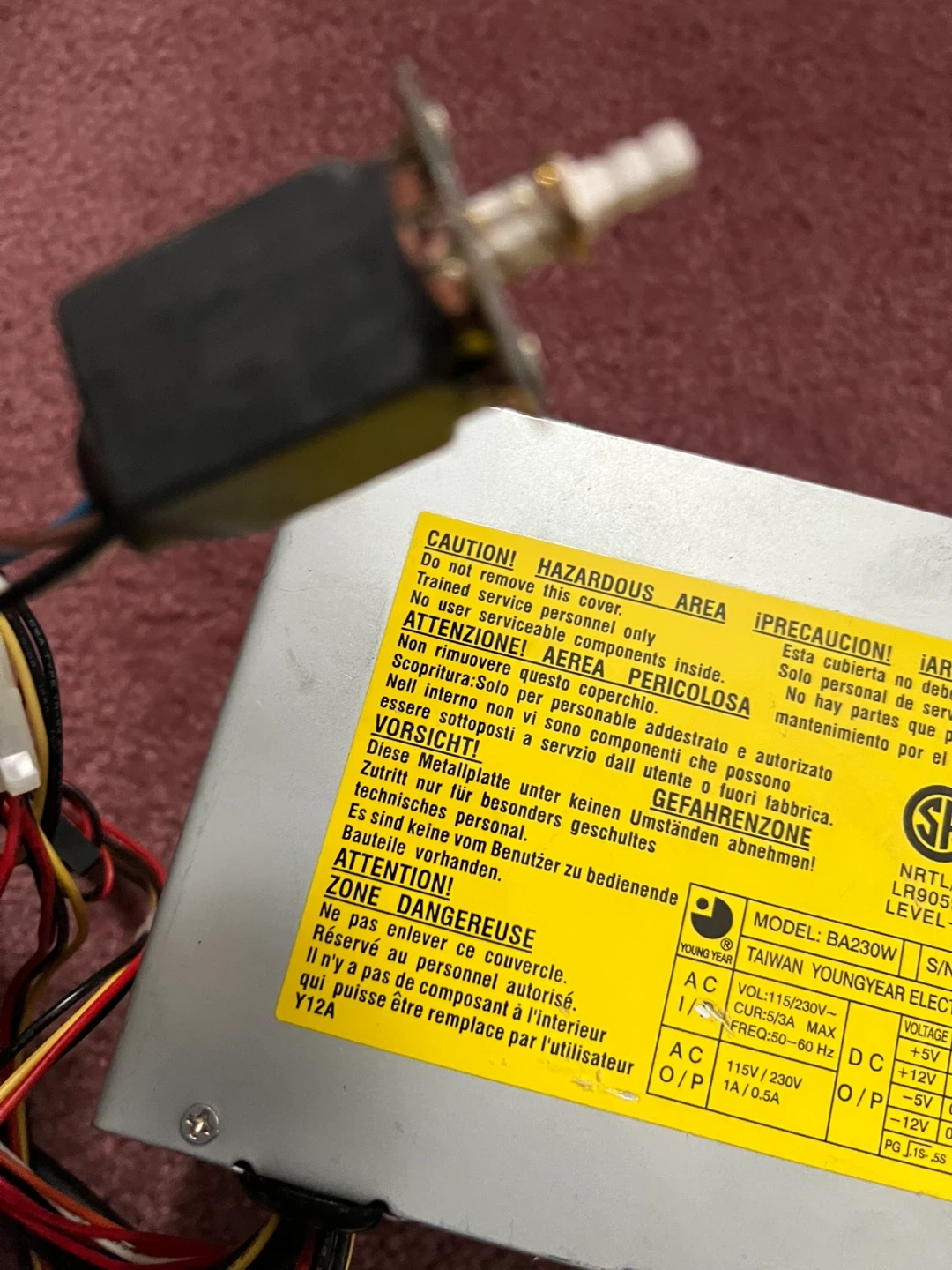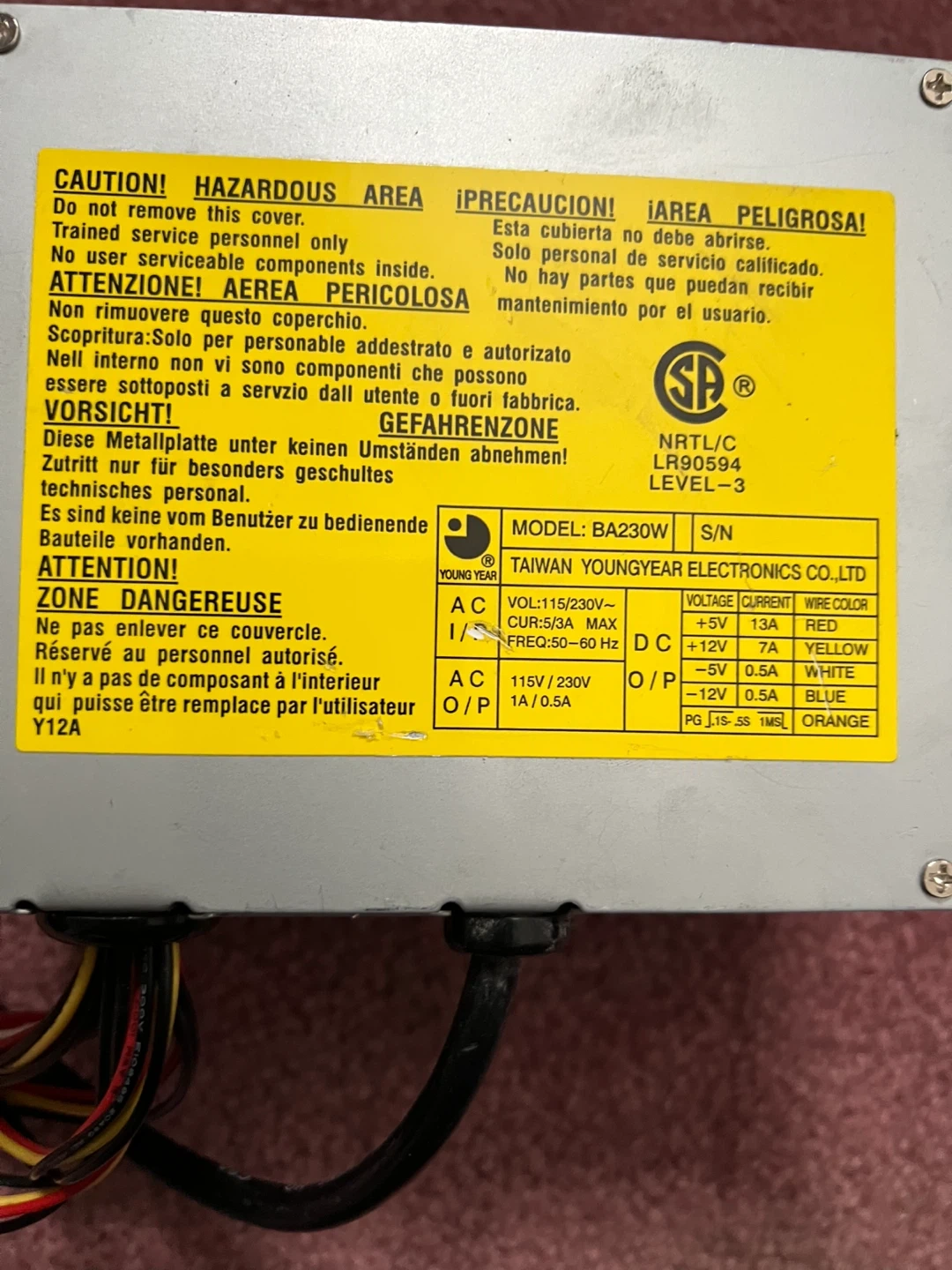 This is a Youngyear BA230W power supply unit. It's a 230W model with various output voltages. AC input voltage is 115V/230V.