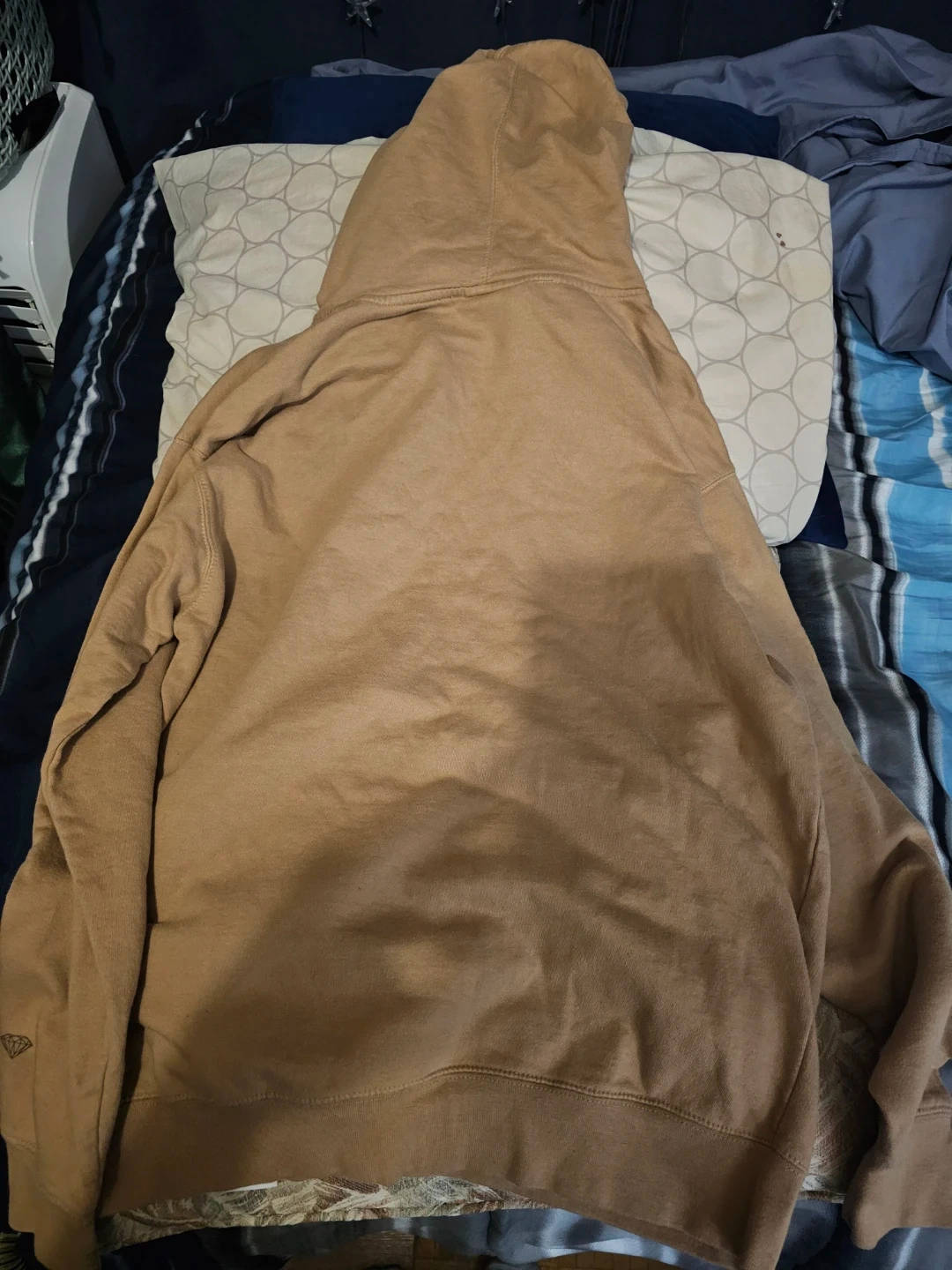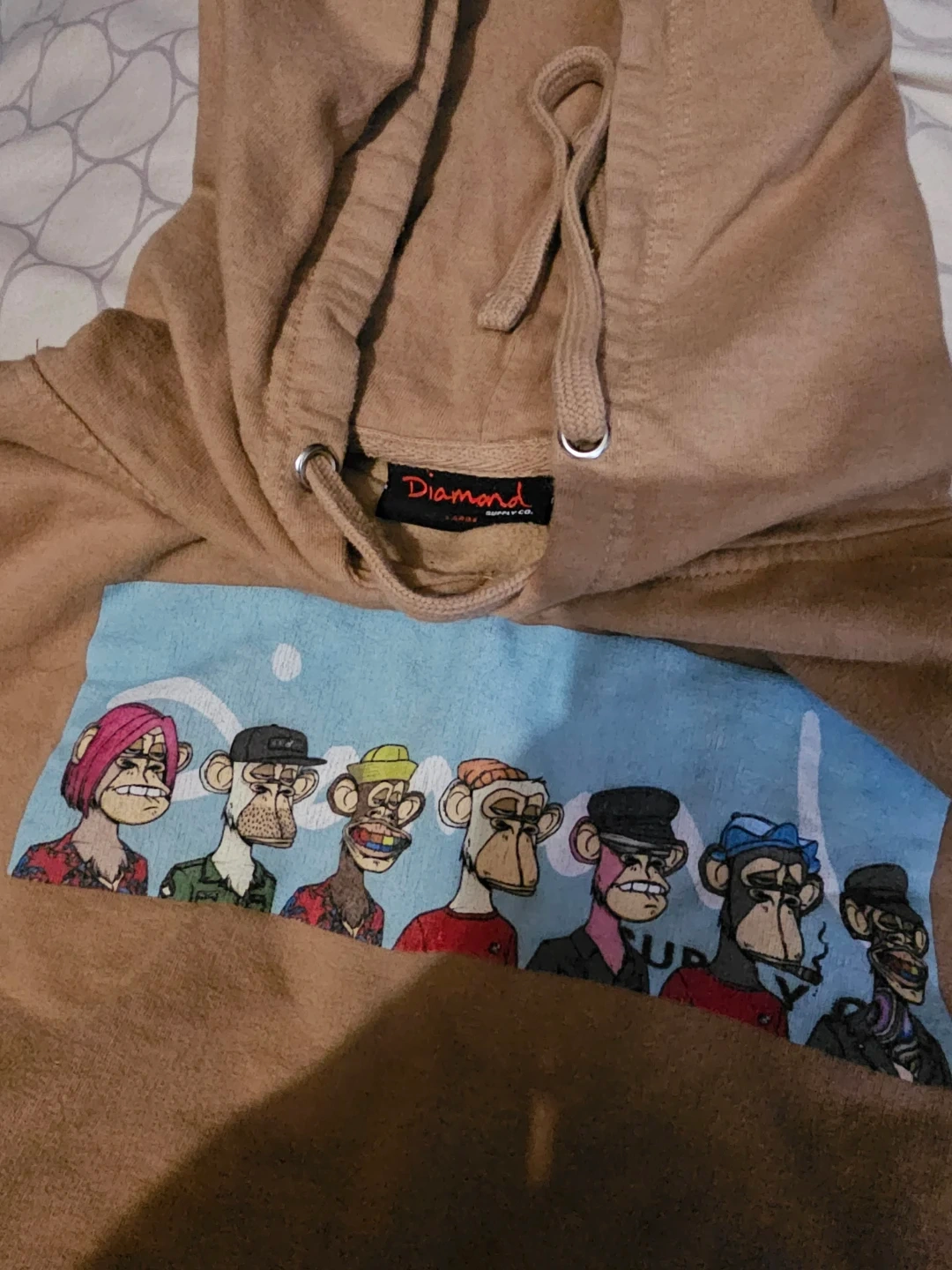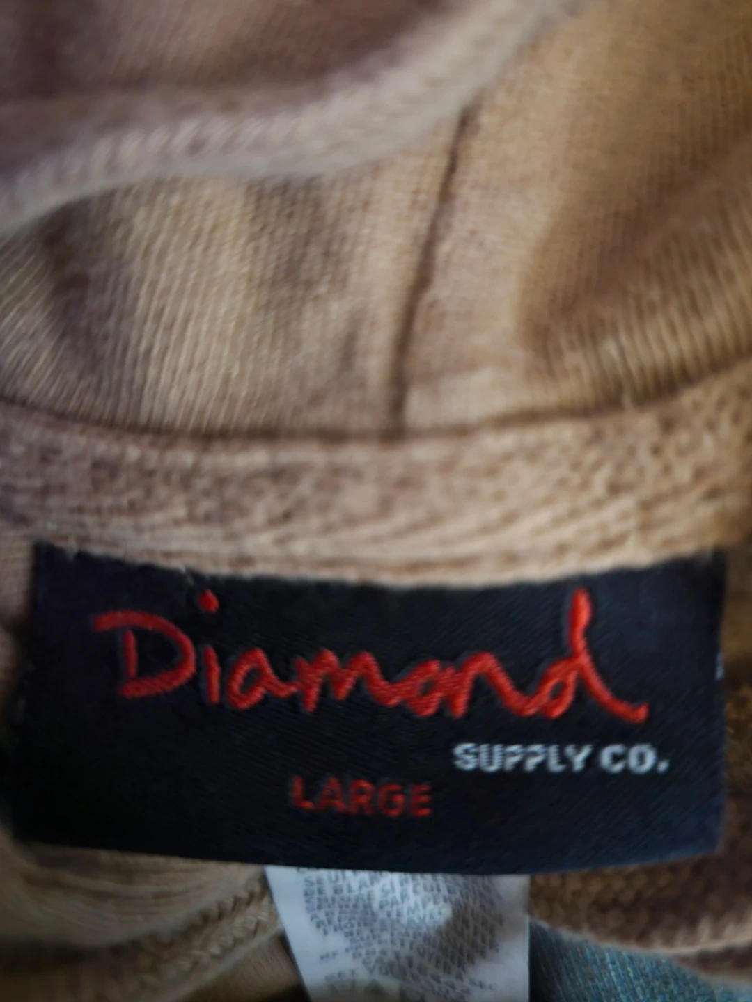 This is a tan Diamond Supply Co. hoodie with a graphic print on the front. It's a size Large. Cotton blend material.