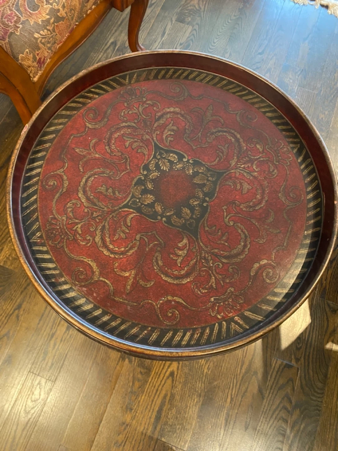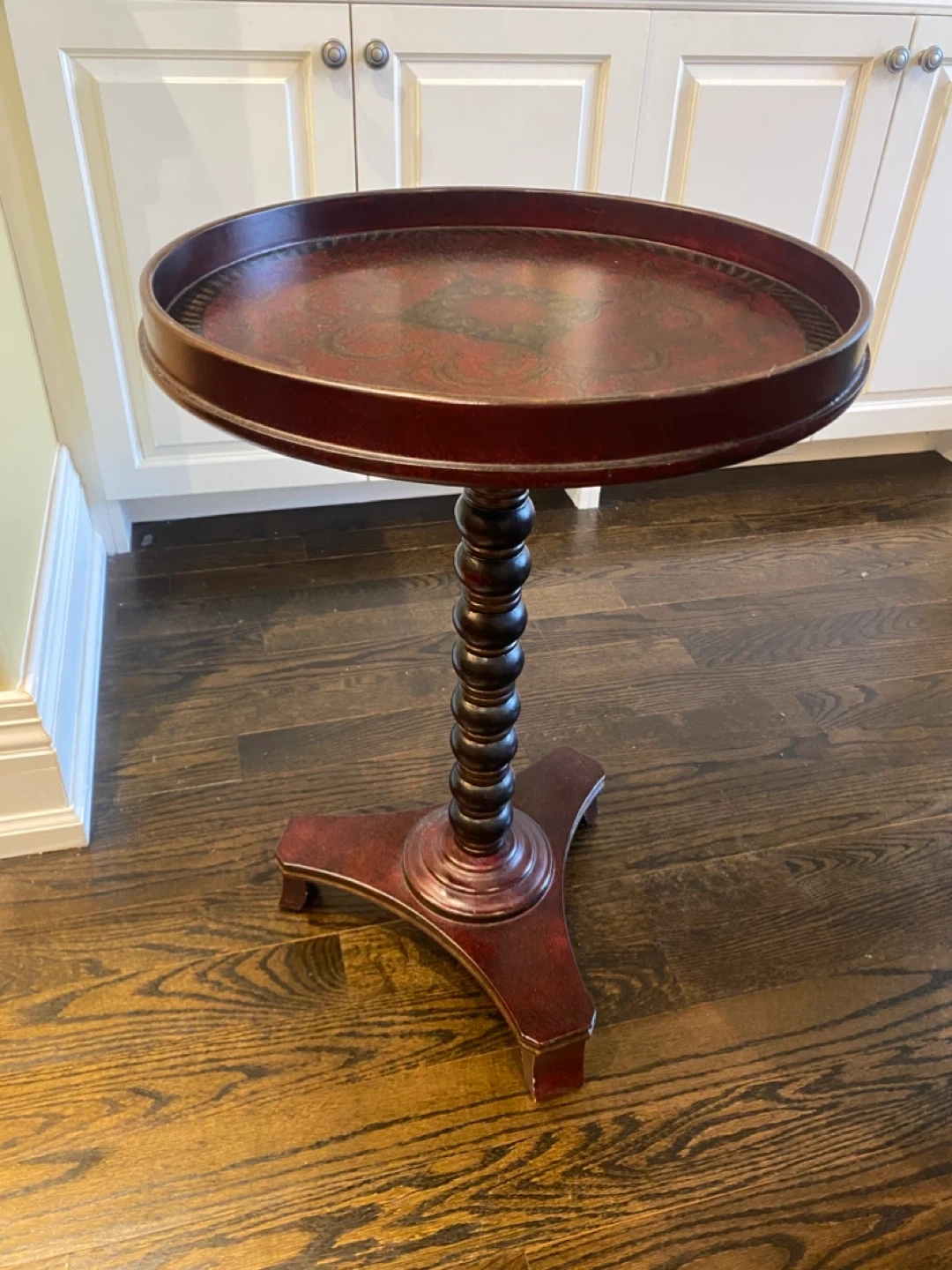 A classic accent table with a dark wood finish and a decorative embossed top. It features a turned pedestal base and a sturdy tripod stand. Great for holding a drink or a small lamp!
