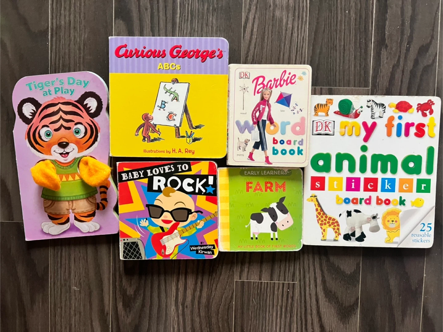 This bundle includes five colourful board books for young children. Titles are Curious George's ABCs, Barbie Word Book, Early Learners Farm, My First Animal Sticker Board Book, and Tiger's Day at Play. They're great for early learning and playtime!