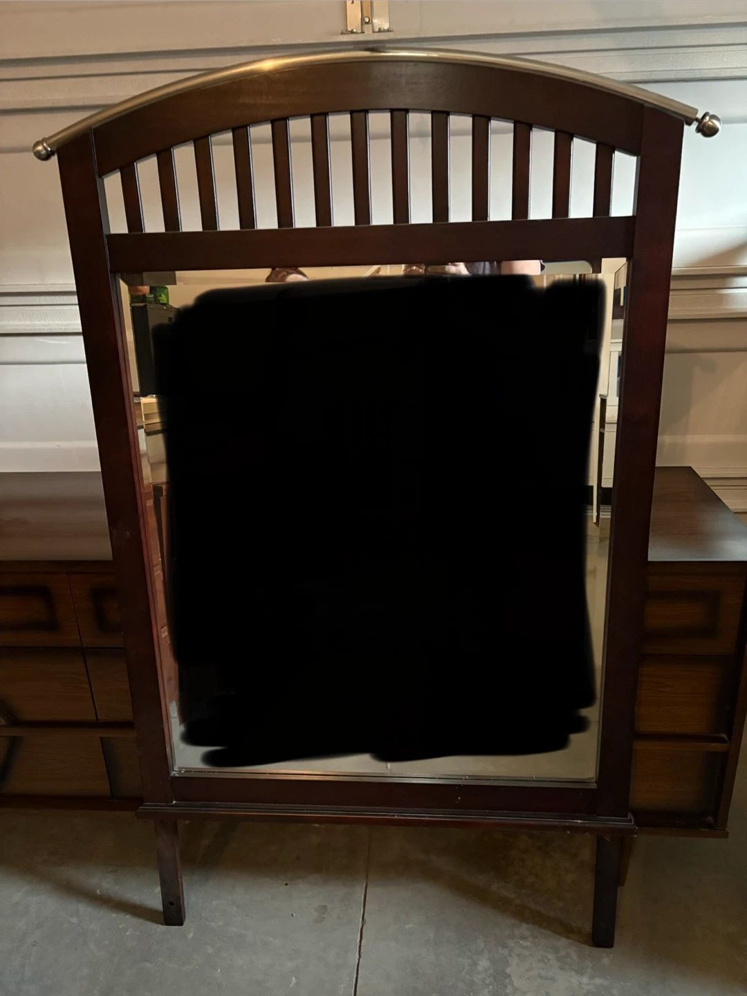 This is a used mirror in good condition, perfect for adding a touch of elegance to any bedroom or dressing area. The mirror is large, providing a full view, and the frame is sturdy and well-maintained, despite being used. It complements a dresser. It is structurally sound, with some cosmetic imperfections.