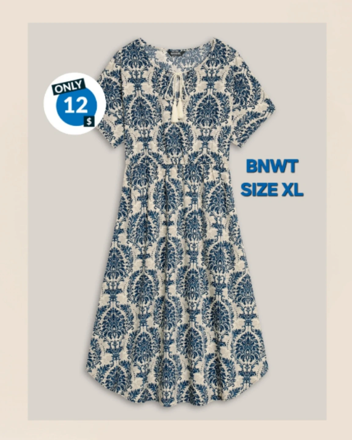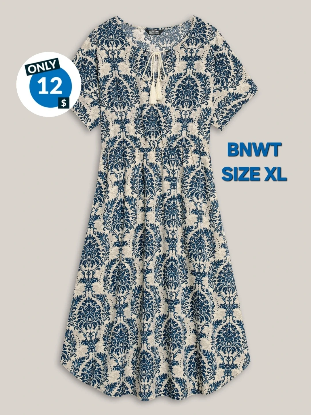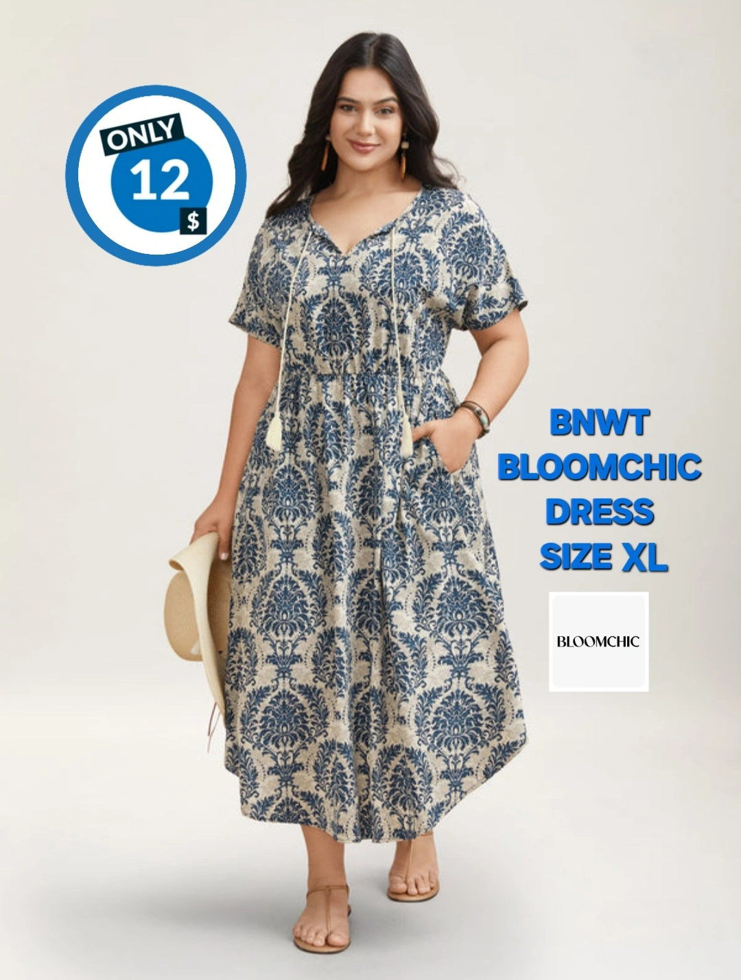 Beautiful Blue Dress -From/Brand: Bloomchic -BRAND NEW WITH TAGS STILL ON! -NEVER WORN! -COMES IN ORIGINAL PACKAGING! -Size: 1X (14W-16W) -Material: See photo gallery for info -Colour: Blue and white-grey -Print: Damask -Modest v-neckline -Tassel ties -Stretchy elasticized waistline -Stretch throughout -Has large pockets! -Mid-calf length on 5'2" frame -Easy machine wash & hang to dry -Carries very few wrinkles (steaming gets them out quickly if you do find wrinkles) Easy to travel with. -Comfortable and cool! -Perfect for late summer weather or for vacay this winter 📸PLEASE SEE PHOTO GALLERY FOR MORE DETAILS ABOUT THIS ITEM📸 Asking only $12 (FIRM & FINAL) 💰CASH ONLY, PLEASE💰 ⚠️Please only message if you are SERIOUS about buying AND you know when you'd like to pick up.⚠️ 🚙Located in North Oshawa BEATRICE & RITSON area.🚙 ⏰️No holds longer than 2 days.⏰️ ❗️CROSS POSTED❗️