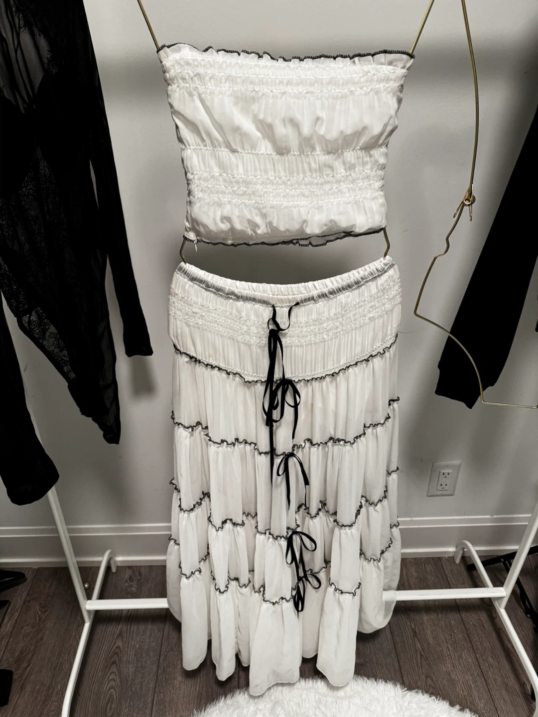60I’m 160cm 60kg it fits perfect. Selling a cute white two-piece set! It includes a tube top and a tiered skirt with black ribbon details. Perfect for summer/vacation/pictures!used once, like new