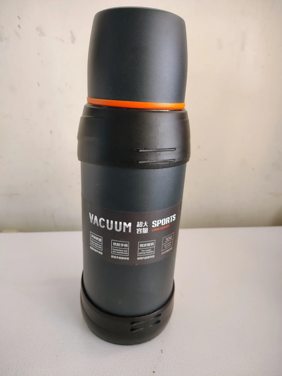 60Selling a vacuum sports bottle with a large capacity! The bottle is black with an orange accent. It features a non-slip handle and a 304 stainless steel construction
