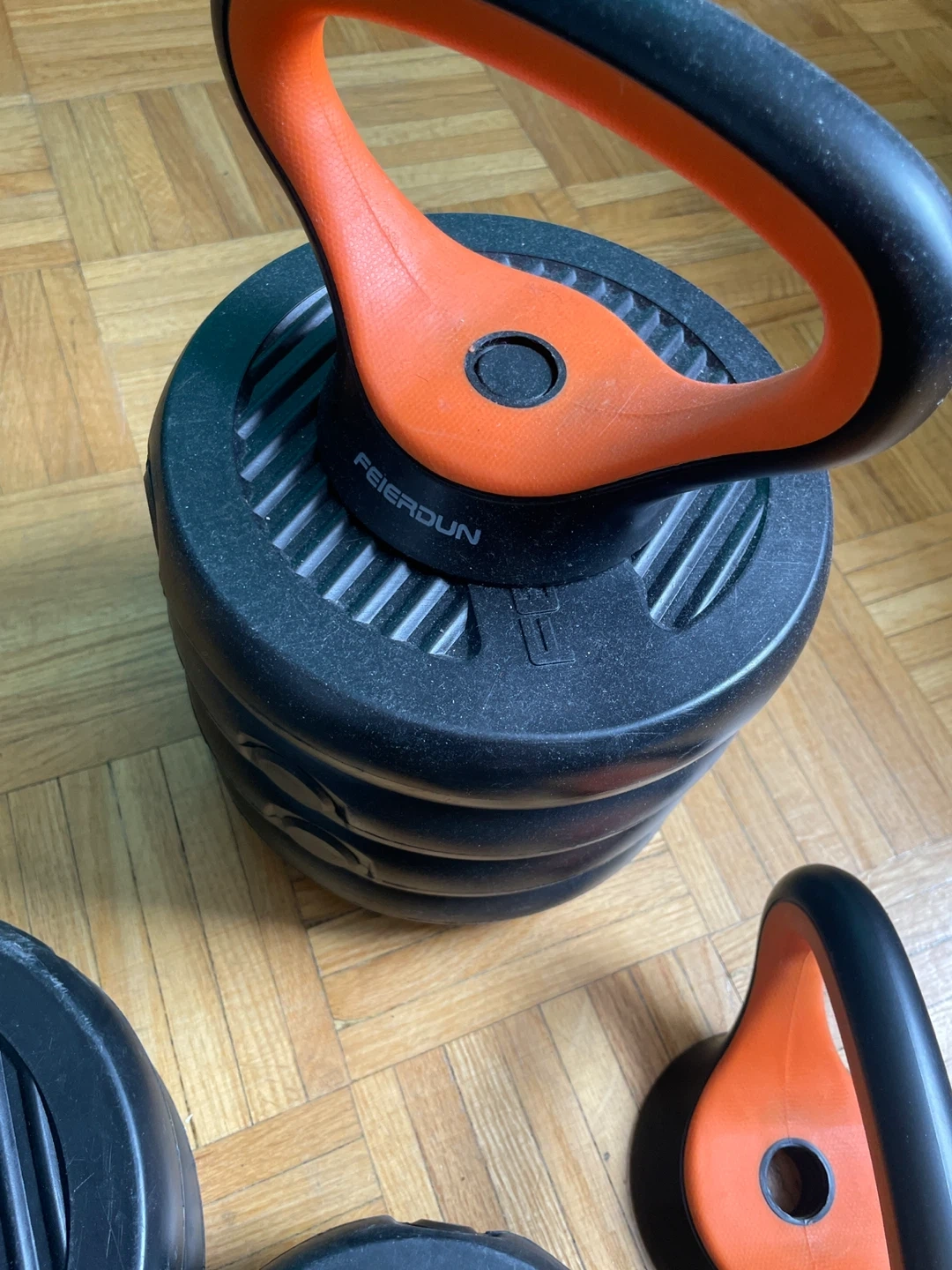 This is a FeiDun adjustable dumbbell set with multiple weight plates.