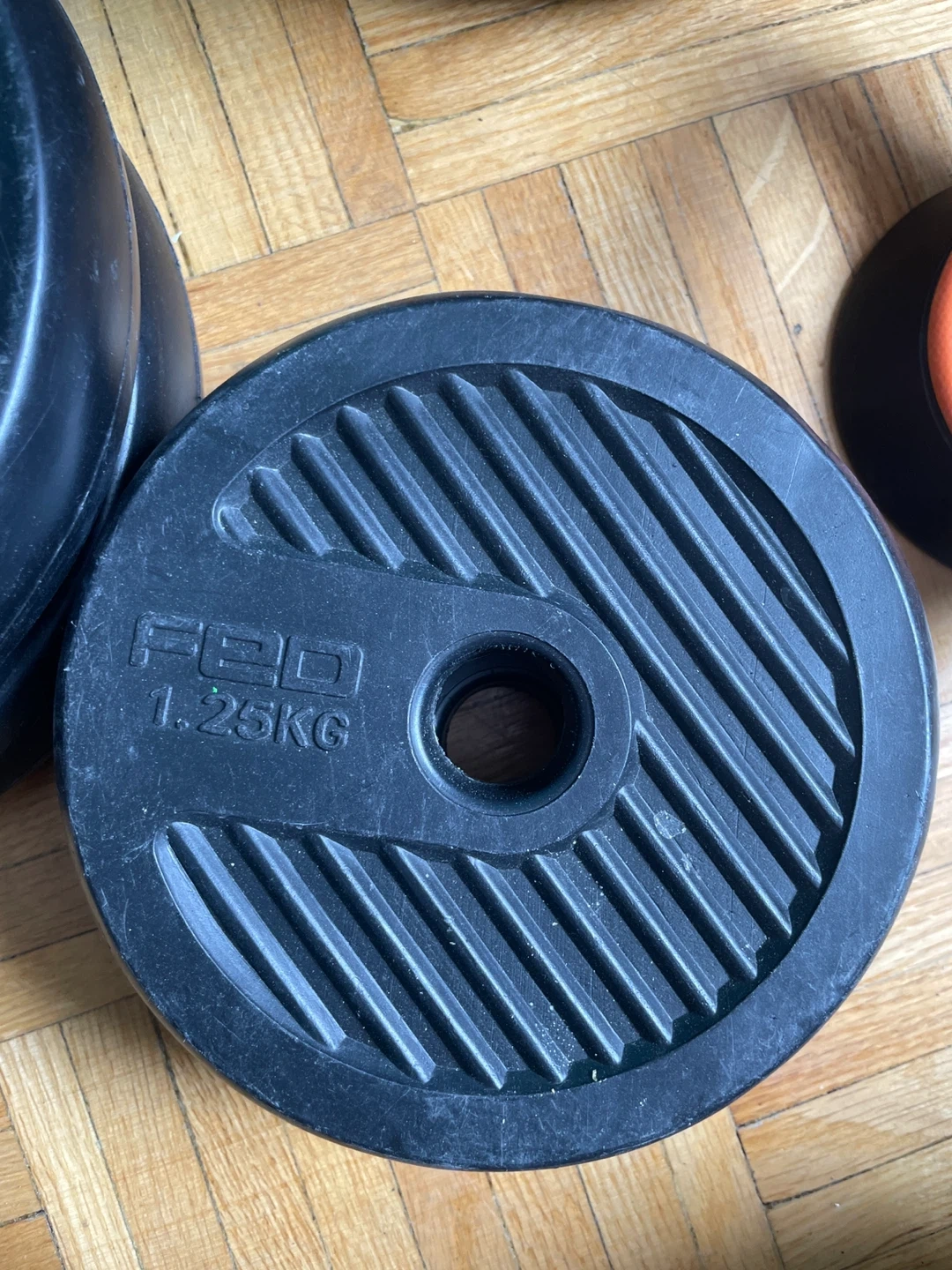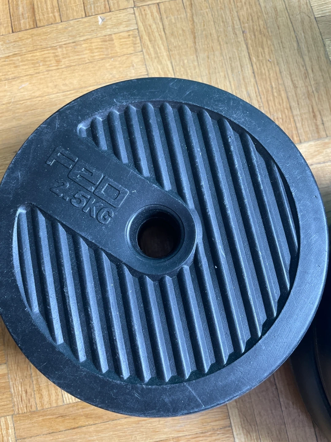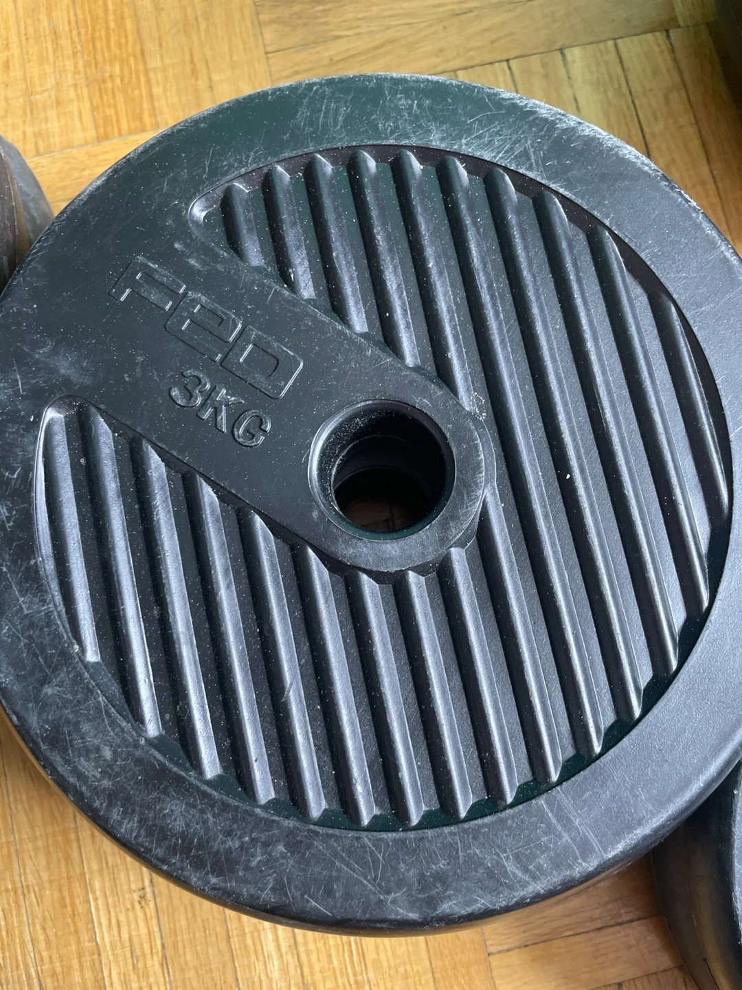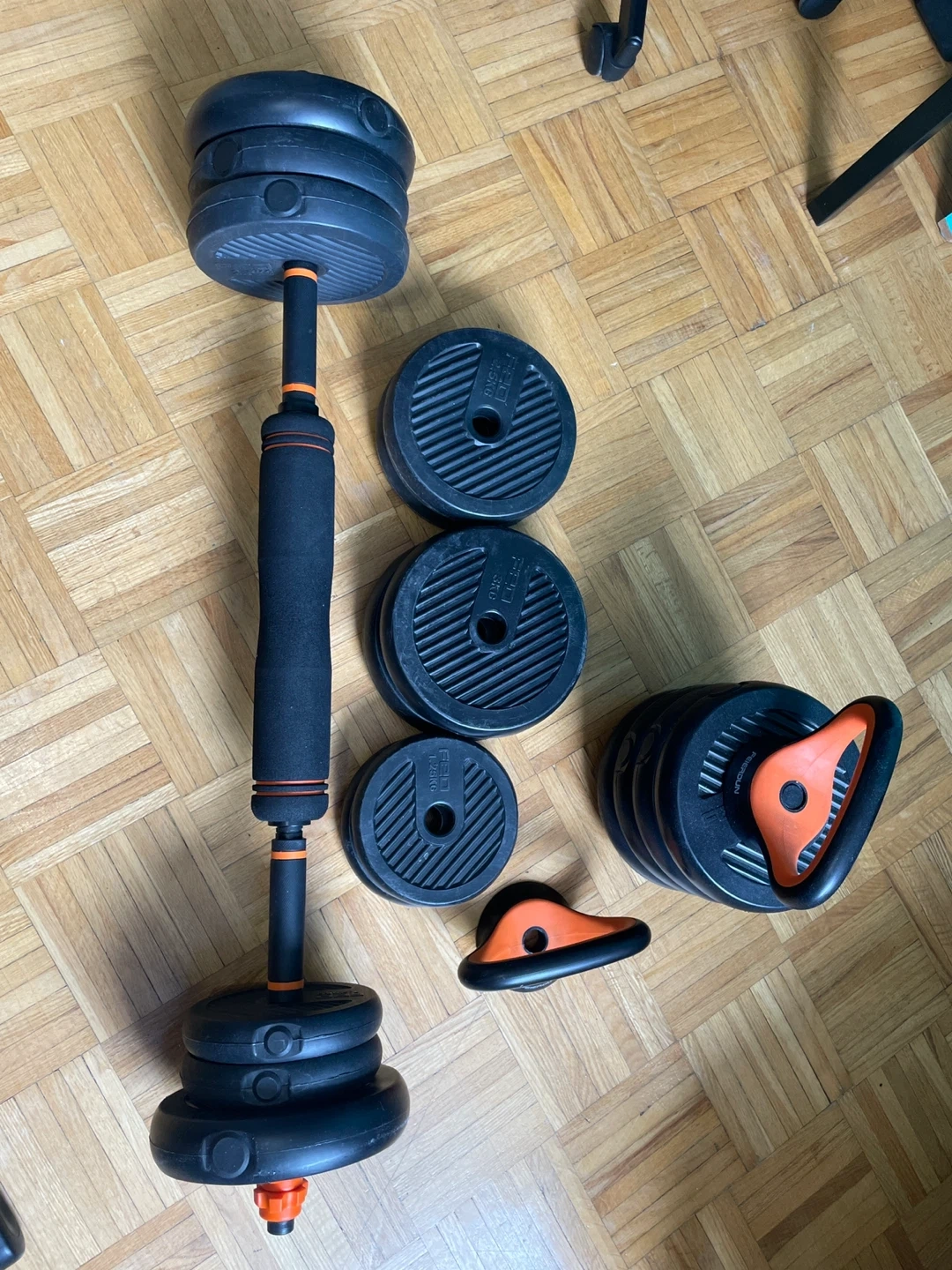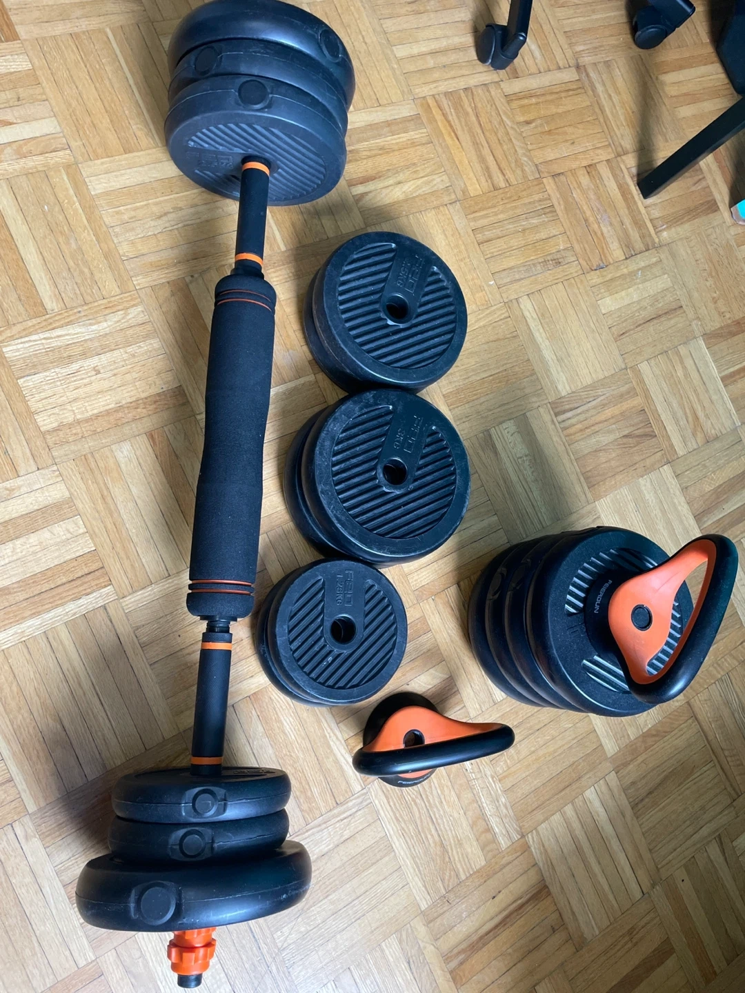 The weight plates are labelled with weights like 1.25KG, 2.5KG, and 3KG. The set comes with orange handle attachments that can be used for kettlebell-style exercises.
