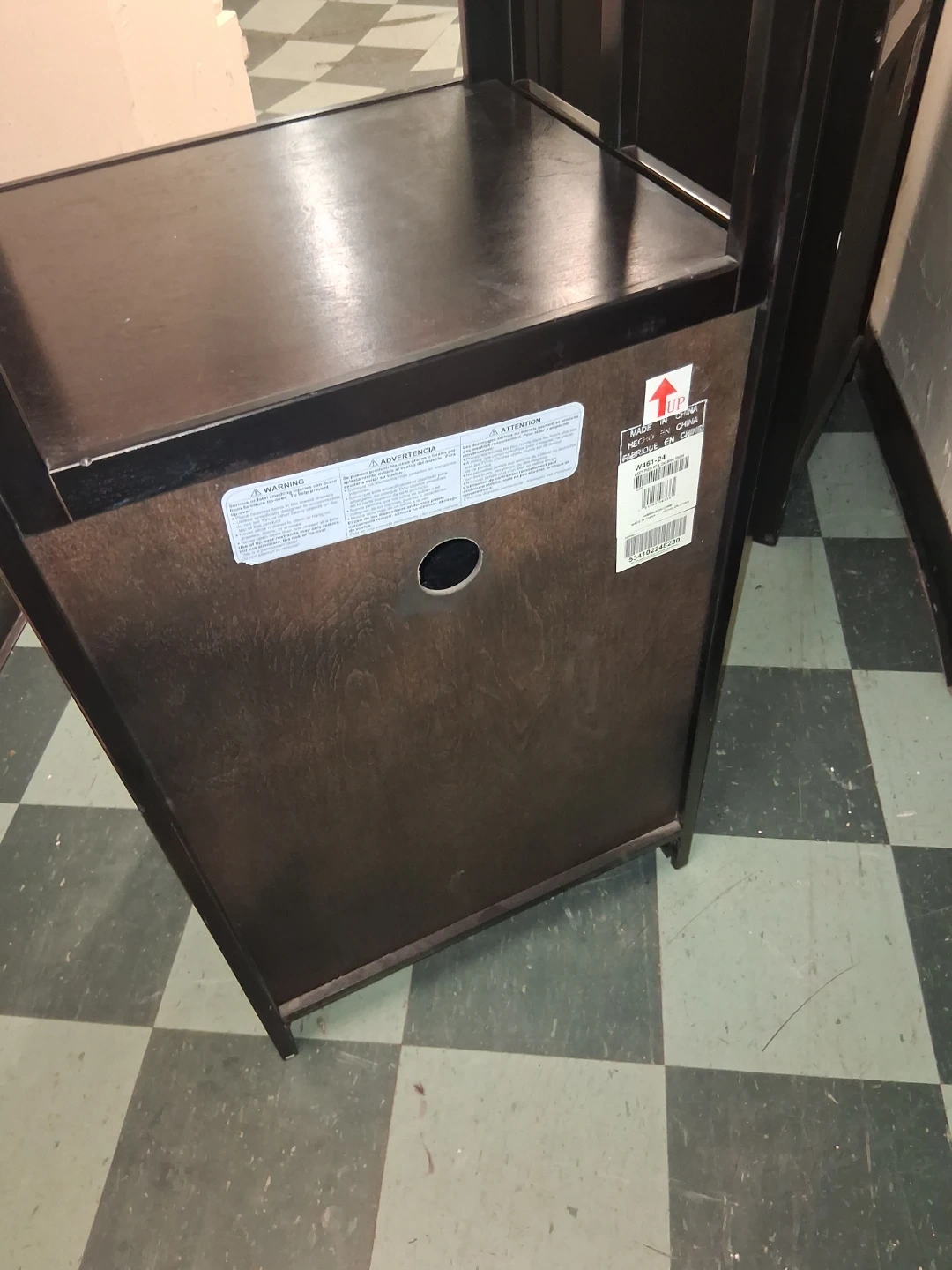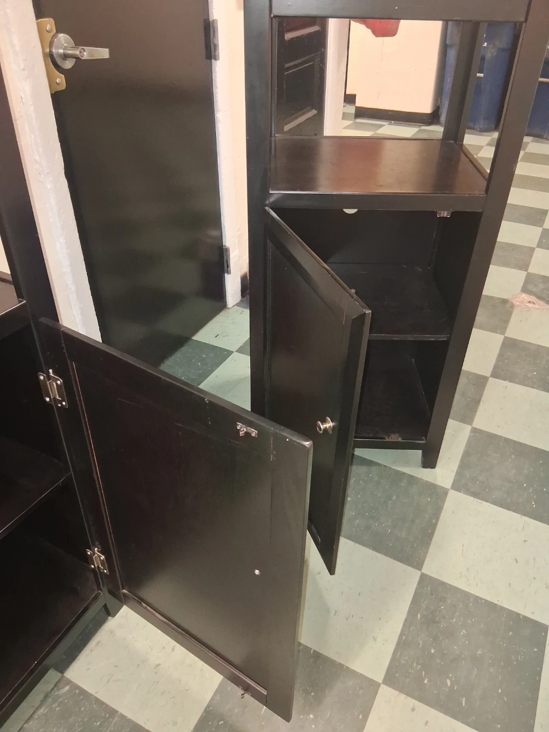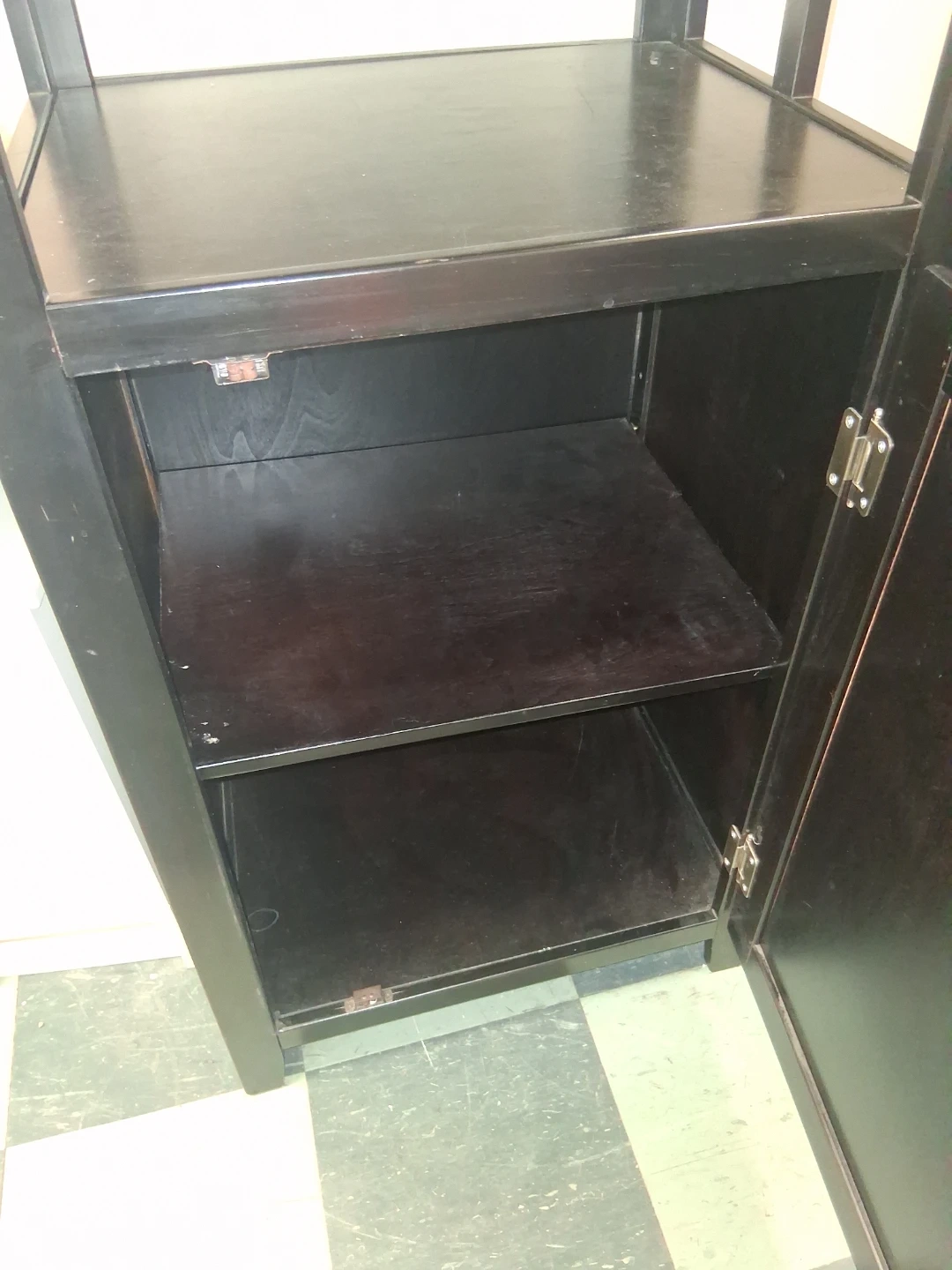 This is a black wood shelf unit with a cabinet at the bottom. It has multiple open shelves above the cabinet space. The cabinet doors are easy to open and close.