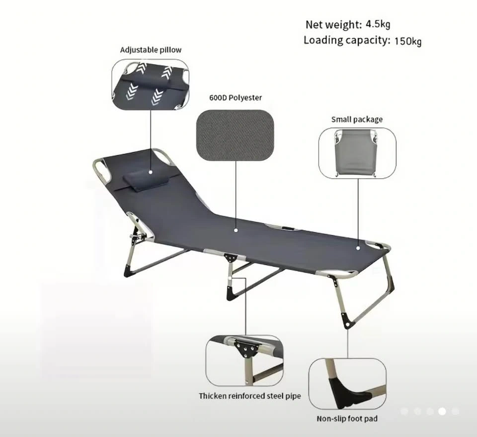 Single folding recliner bed with sturdy iron frame. Lightweight, portable, and easy to fold—perfect for outdoor use, camping, car camping, patio, or relaxing.