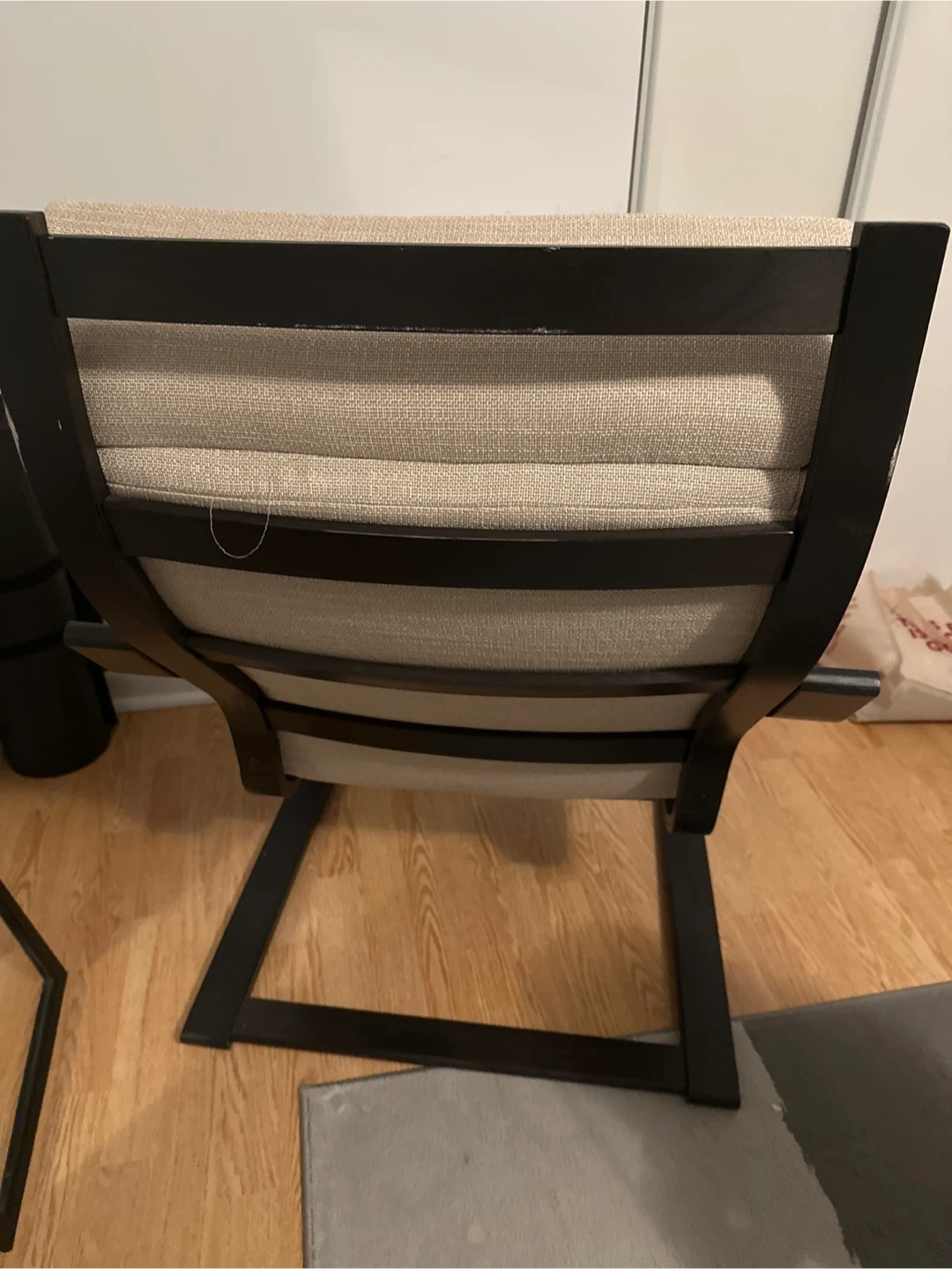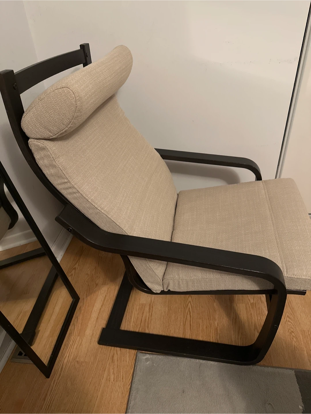 Selling a gently used IKEA Poang chair! It's in great shape and super comfy for relaxing. The frame is a dark colour and the cushion is a neutral beige colour. A perfect addition to any living room or reading nook!