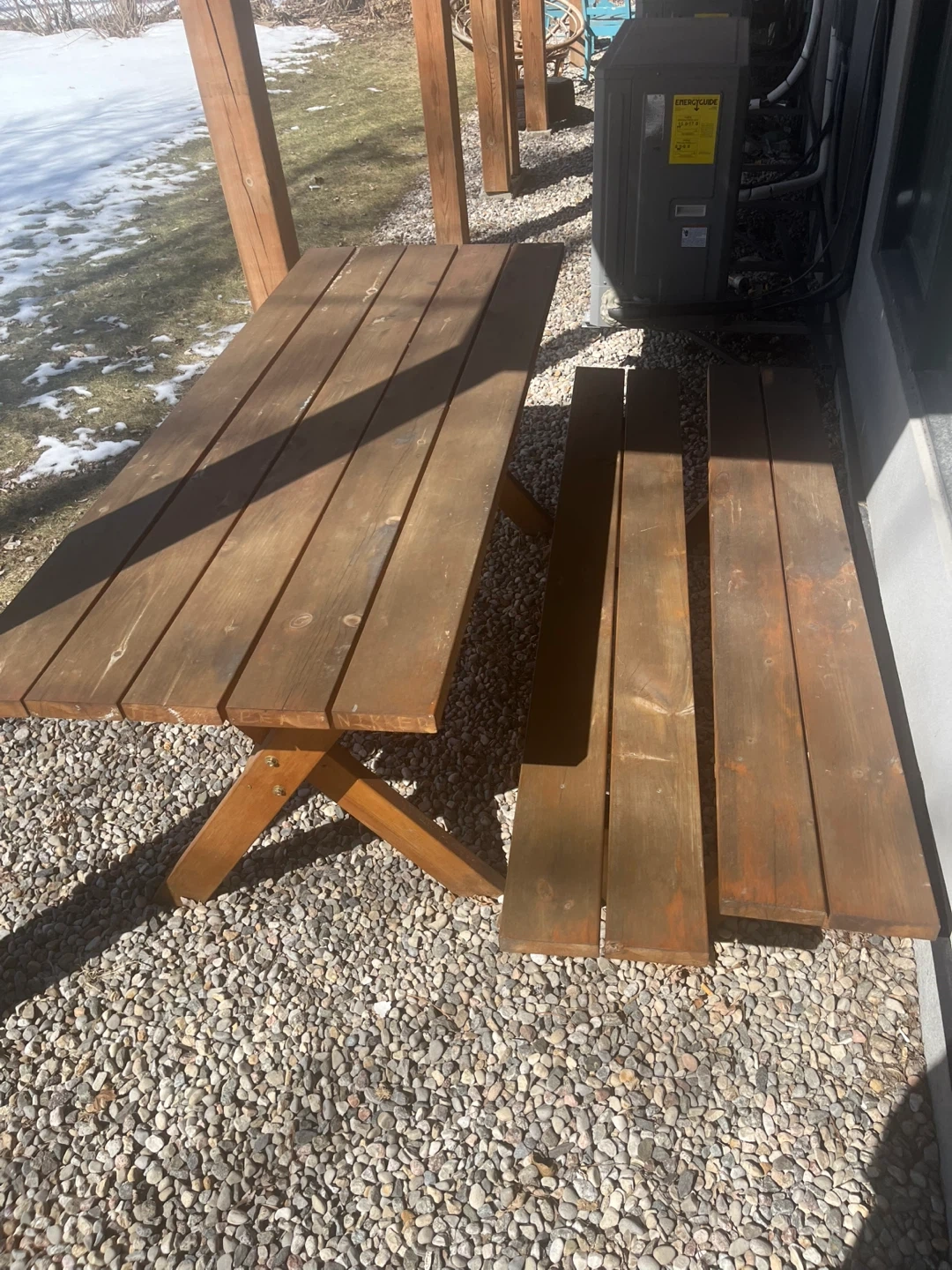 Solid wood picnic table with attached benches. Perfect for outdoor gatherings or dining. Sturdy construction for lasting use.
