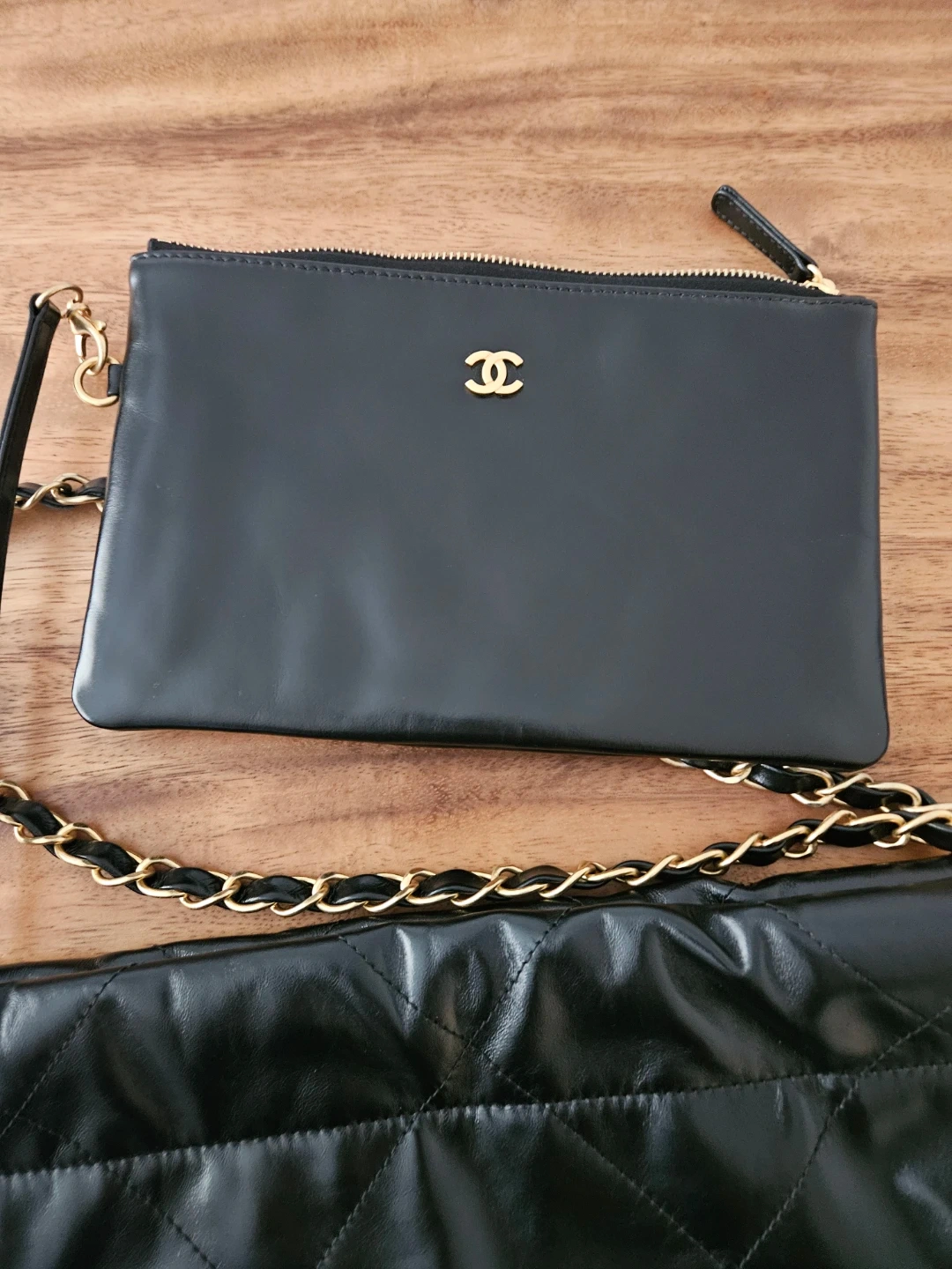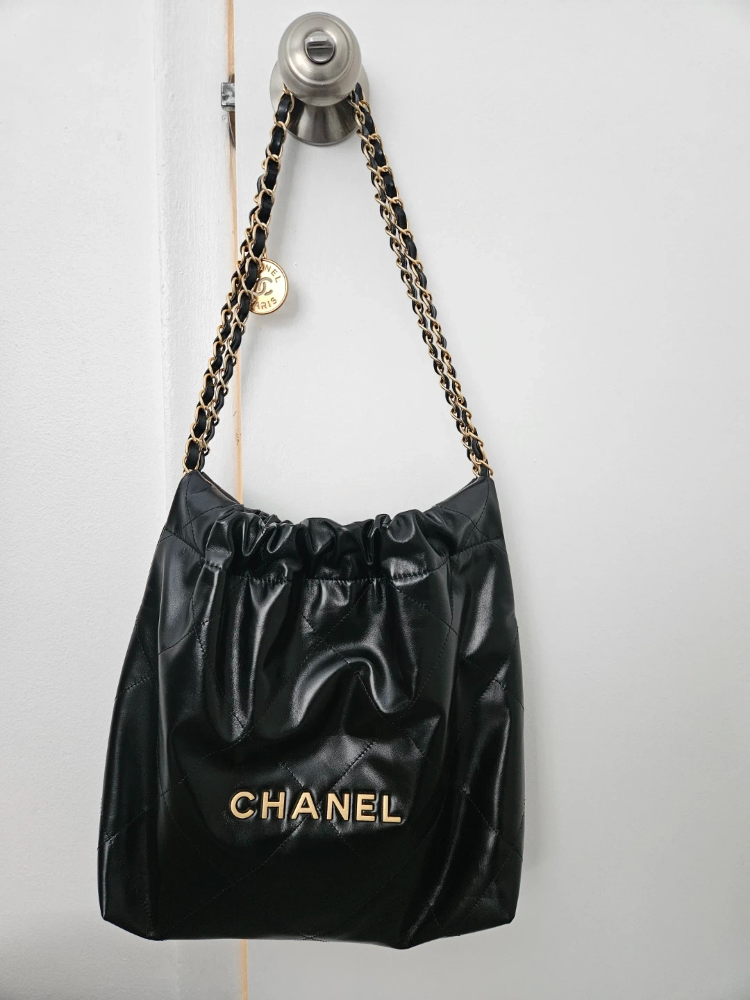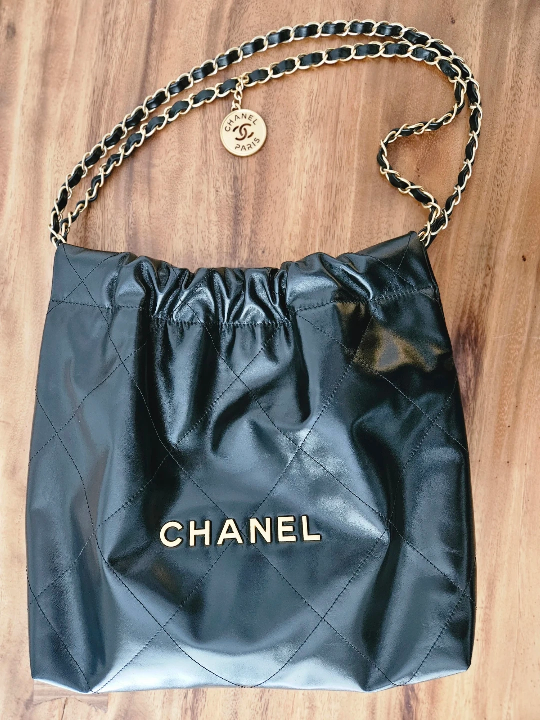 It is 1:1 quality 22 bag small size shiny calfskin black in gold hardware. I've added a discreet anti-wear pad to the chain drawstring area.