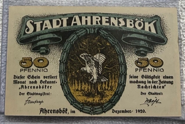 Check out this 50 Pfennig Notgeld banknote from the city of Ahrensboek, Oldenburg, Germany, dating back to December 1920! In pristine uncirculated condition, it's a fascinating piece of German history! These were created in response to a shortage of circulating currency during World War I and the turbulent postwar period in Germany. If the ad is up, it's available—no need to ask! Happy collecting!