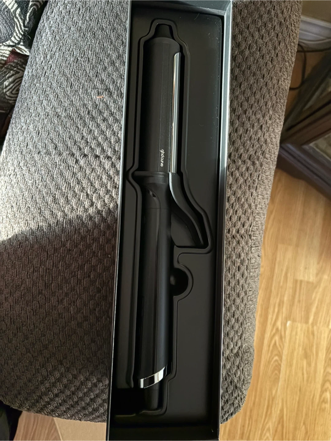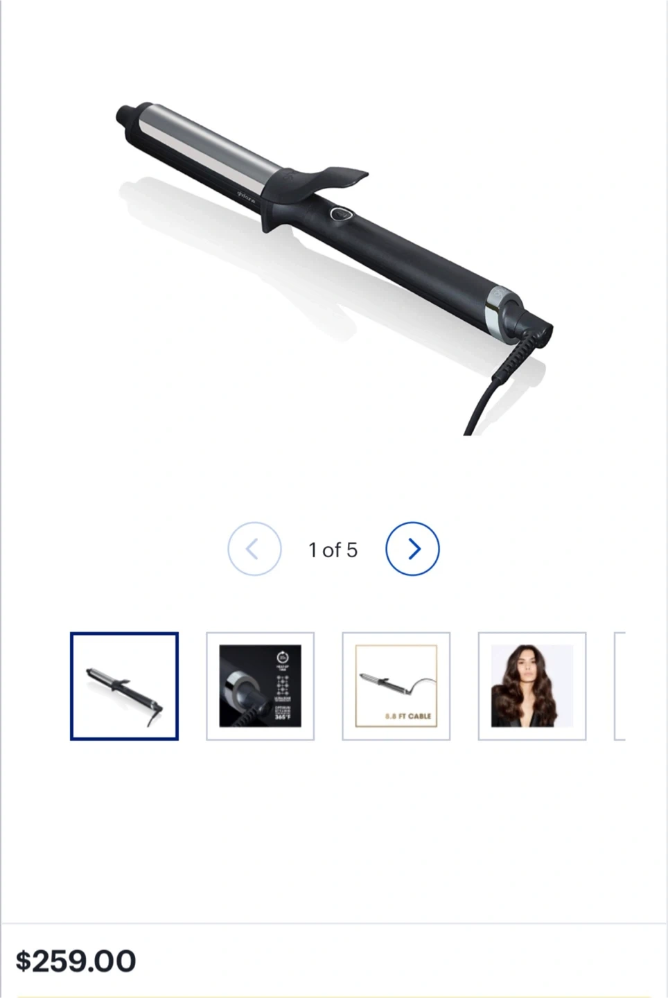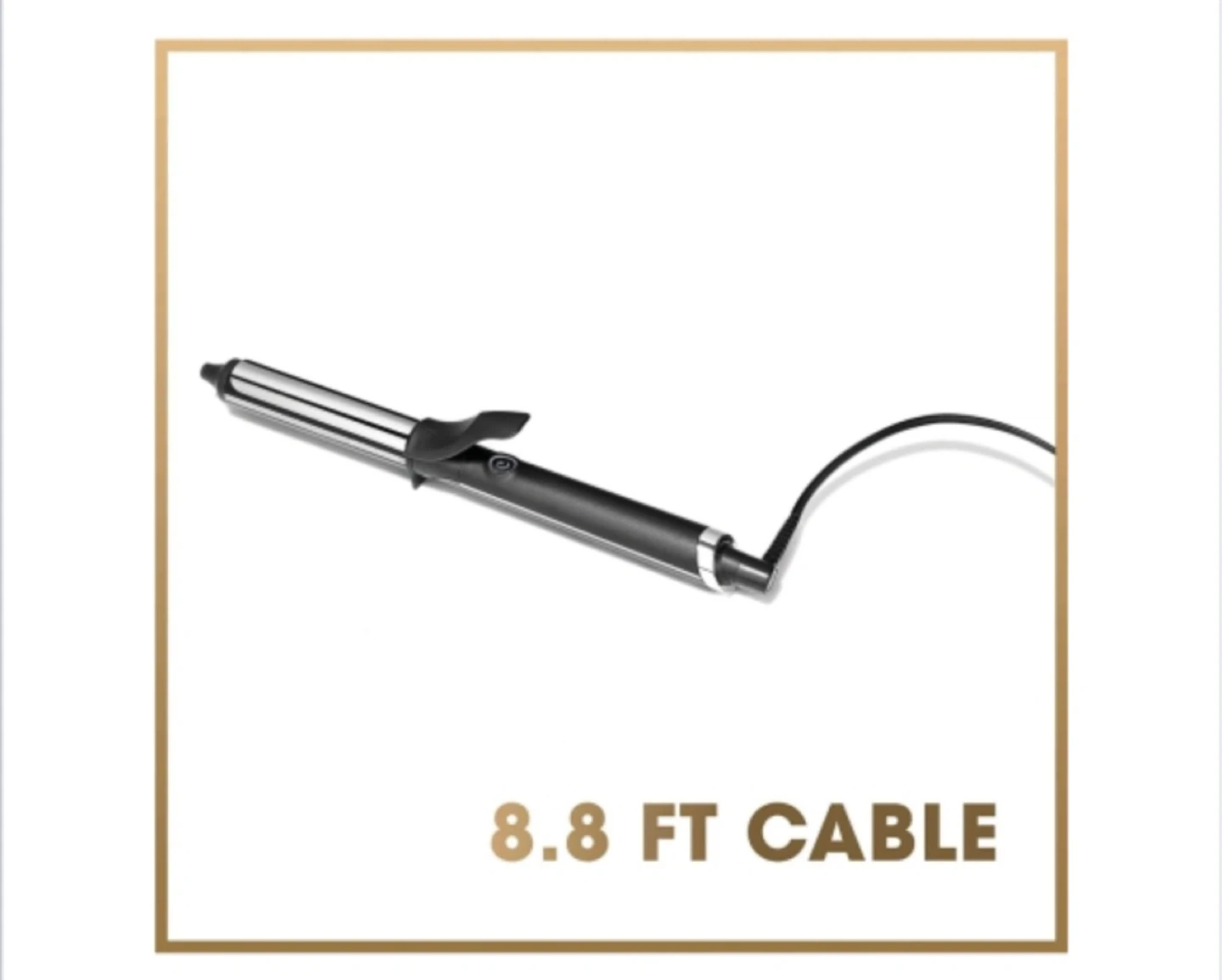 This is the ghd Curve Iron Soft Curl hair wand. It features ultra-zone technology for optimum styling temperature at 365°F. Heat-up time is 25 seconds. The cord is 8.8 ft long.