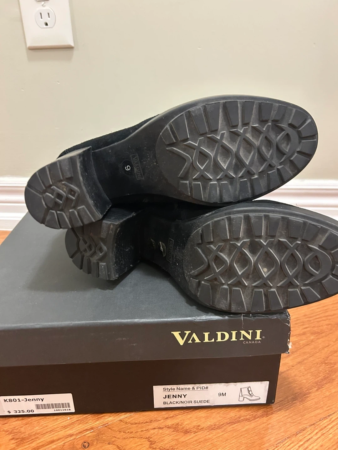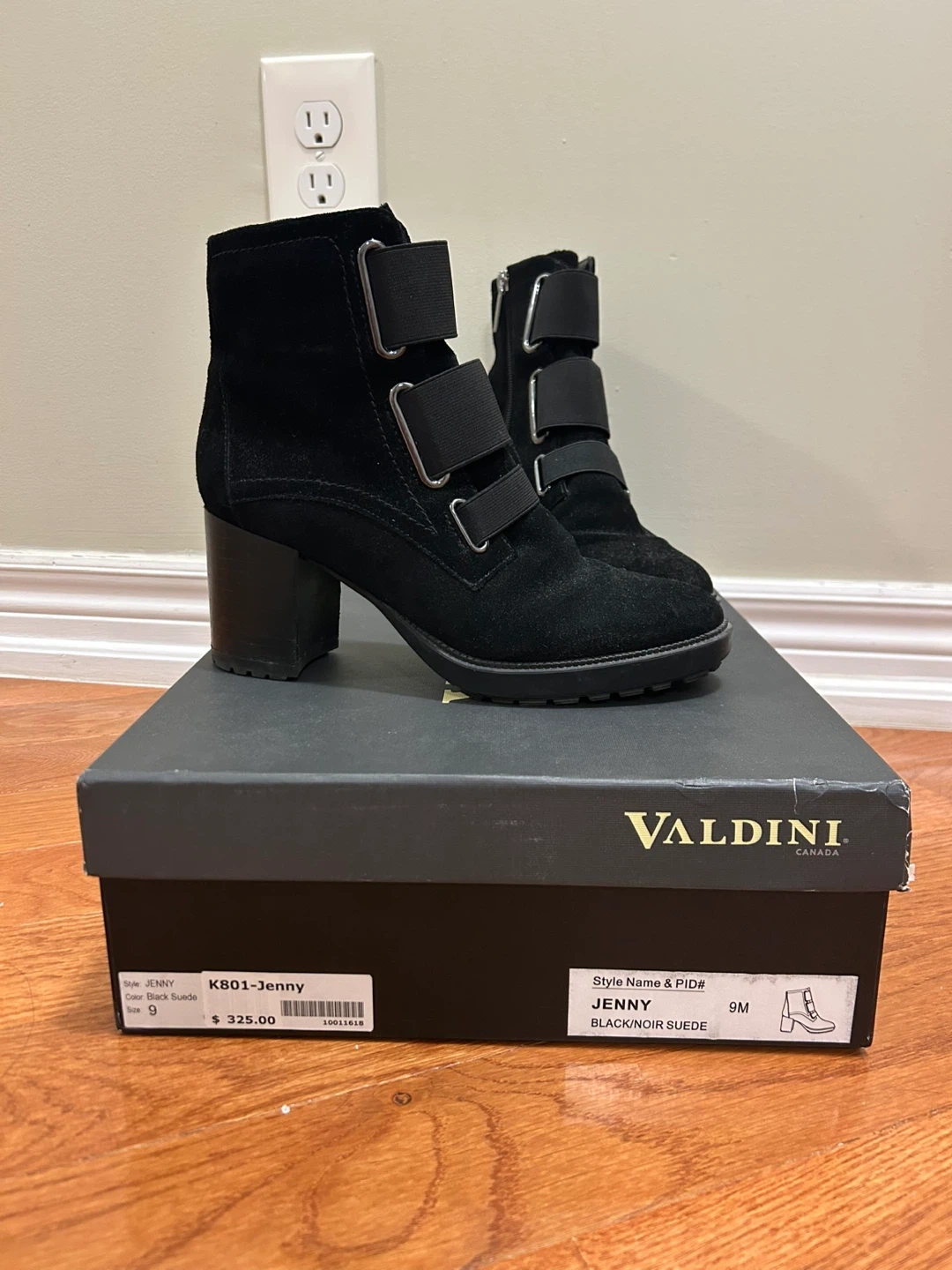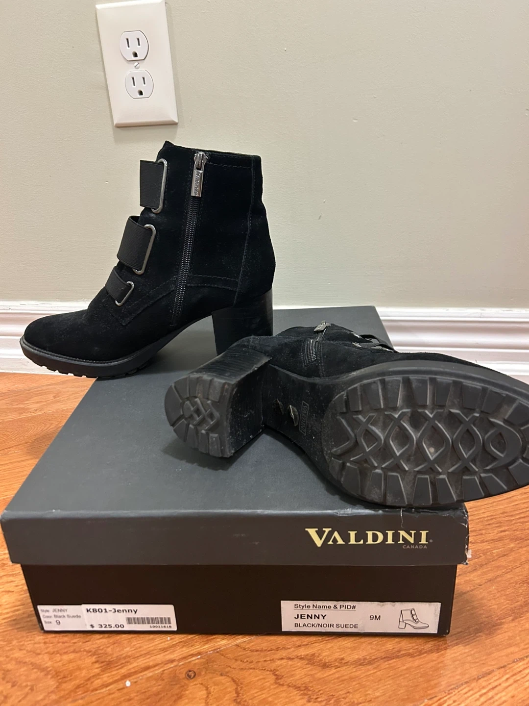 68Selling a pair of Valdini Jenny boots in black suede, size 9. These stylish boots feature a comfortable block heel and a unique strap design. They come with the original box. Originally bought for $325.00