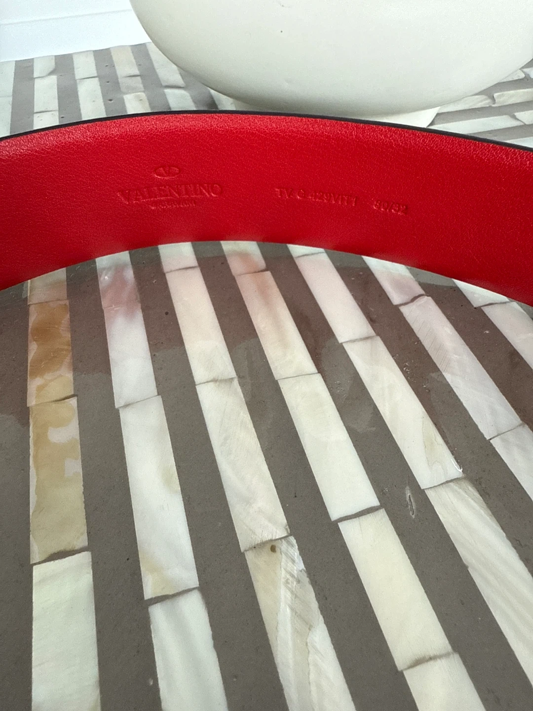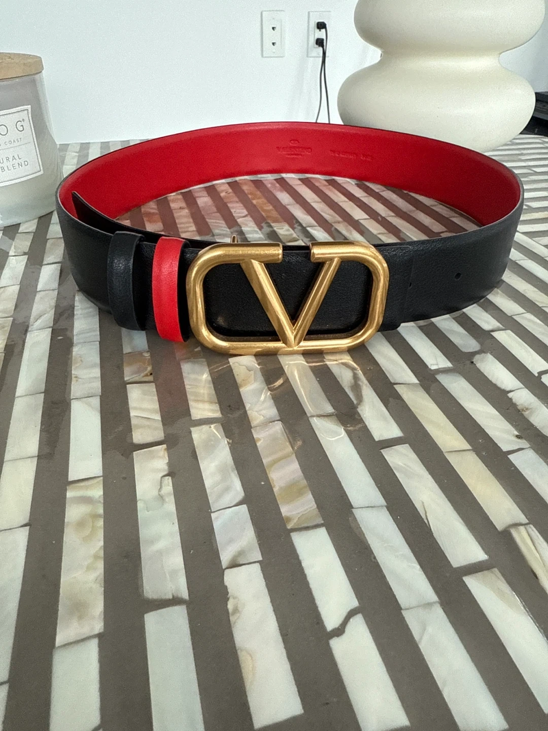 Selling a Valentino black leather belt in size 30/82. The belt features a striking red interior and a bold gold-tone 'V' buckle. It's in brand new condition, only used once and ready to add a touch of designer flair to your wardrobe
