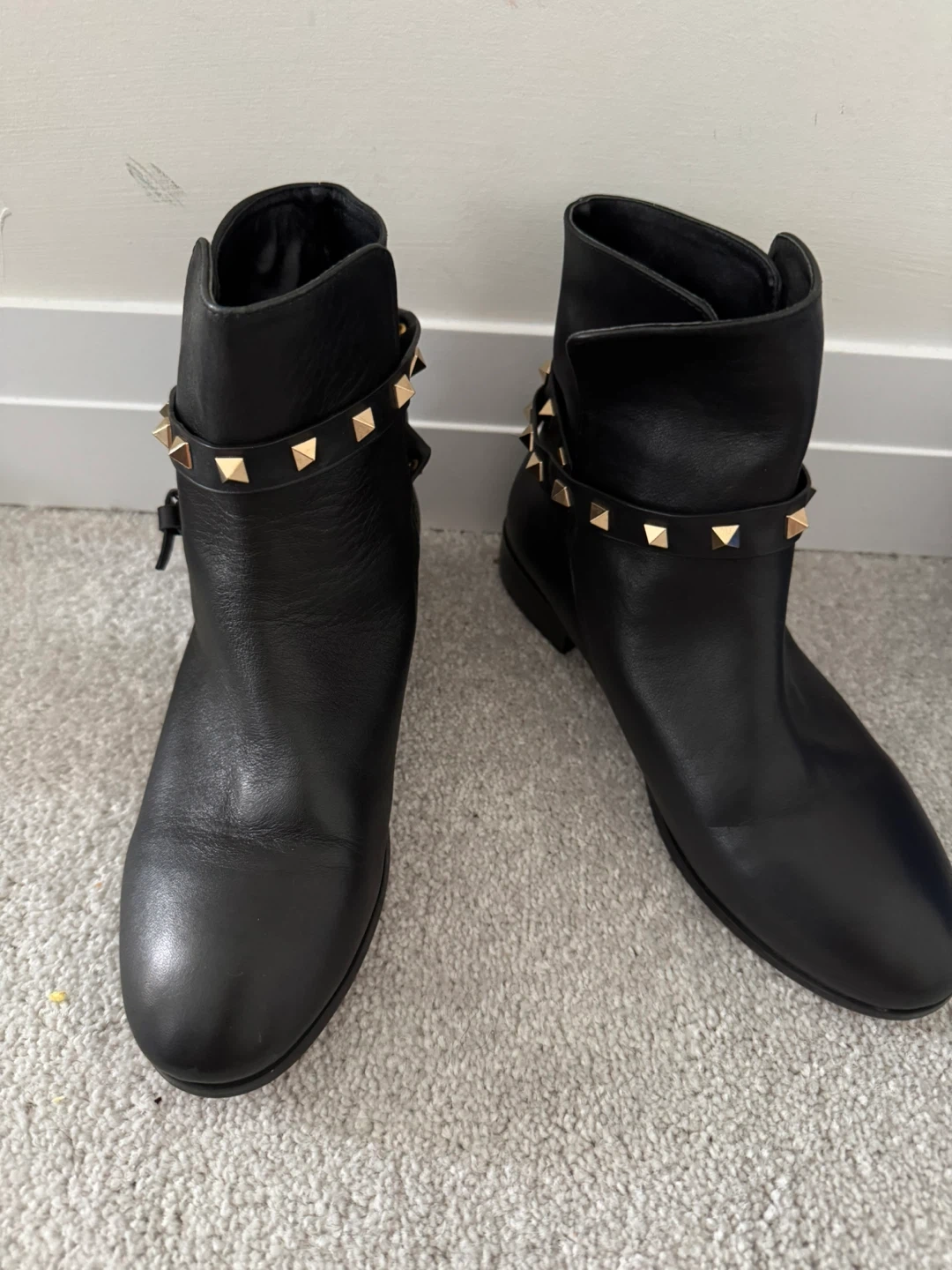 65Selling a pair of Valentino black leather ankle boots. They feature a stylish studded design. Size 37, which is about a US size 7. These boots are in good condition and ready for a new home!