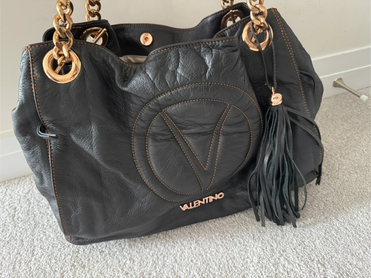 65This is a lovely Valentino black leather tote bag. It features gold-tone hardware and a tassel detail. It's in great condition and ready for a new home!