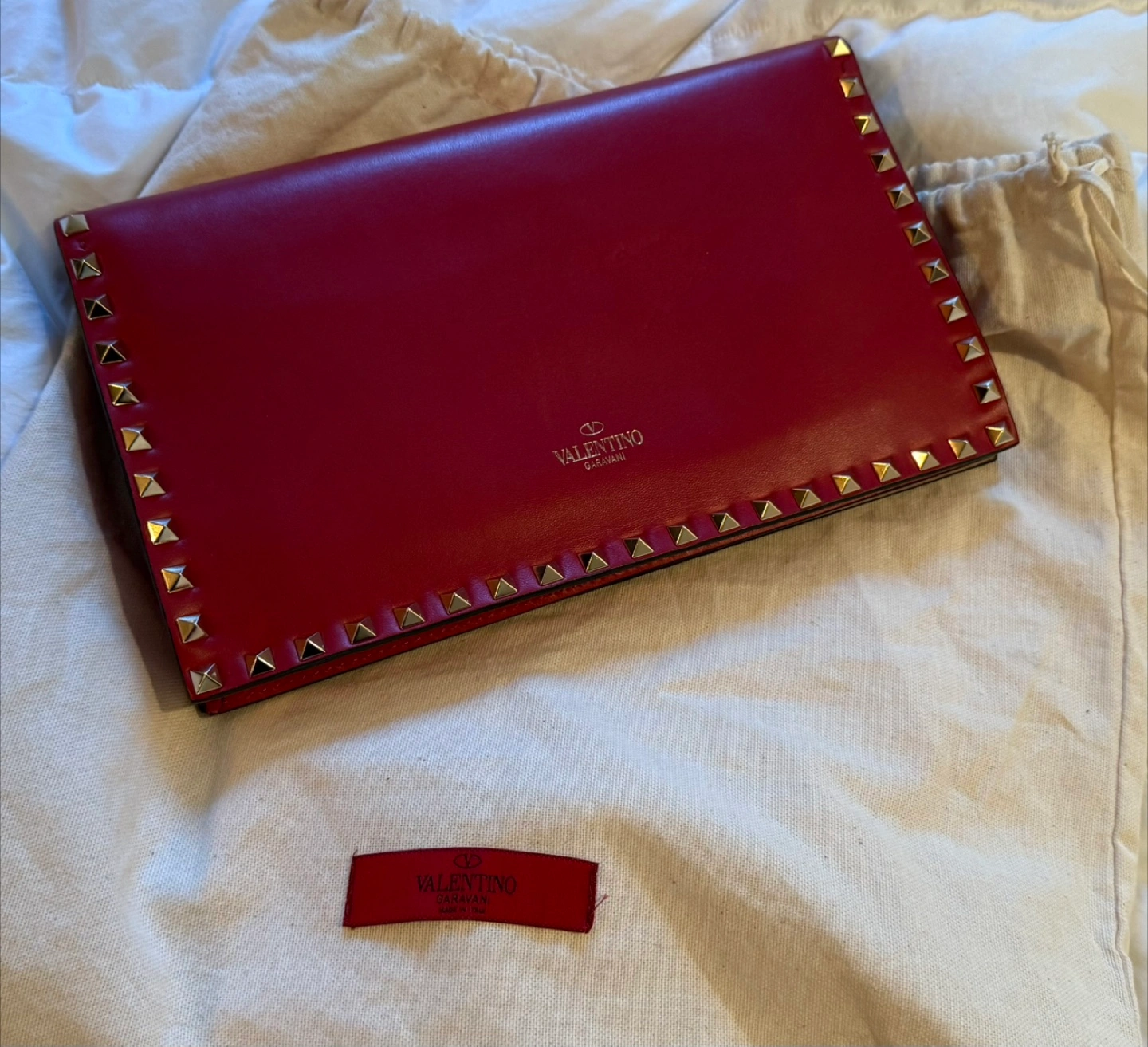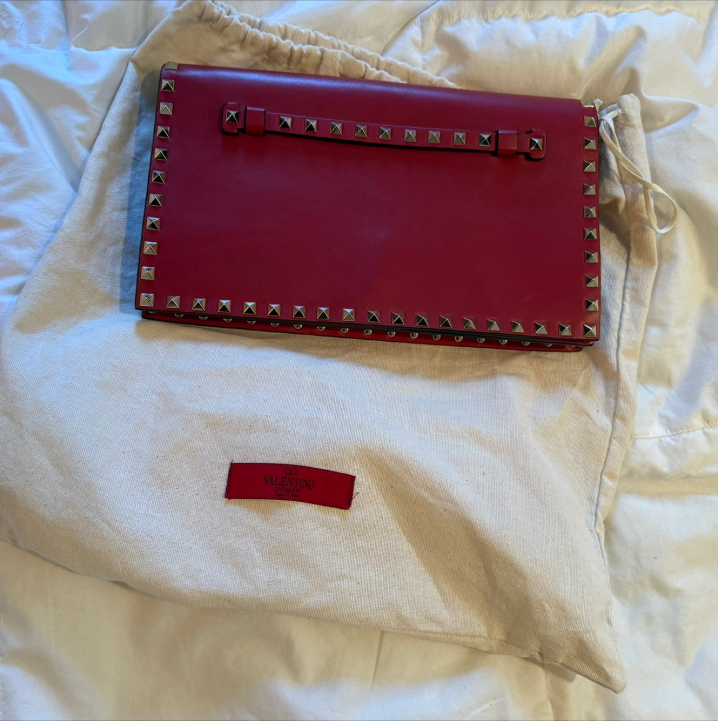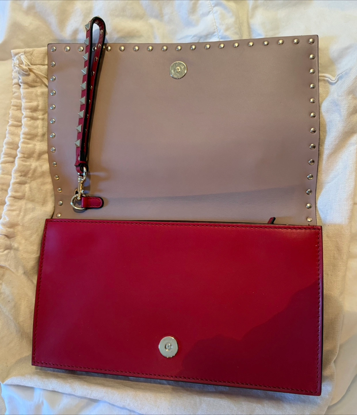 250Authentic Red leather Valentino Garavani Rockstud clutch with gold studs and a removable wrist strap. Interior features a zippered pocket. Comes with dust bag.