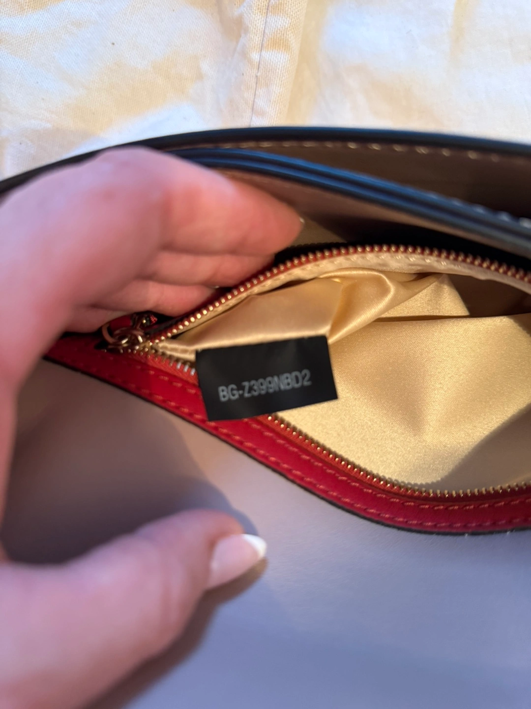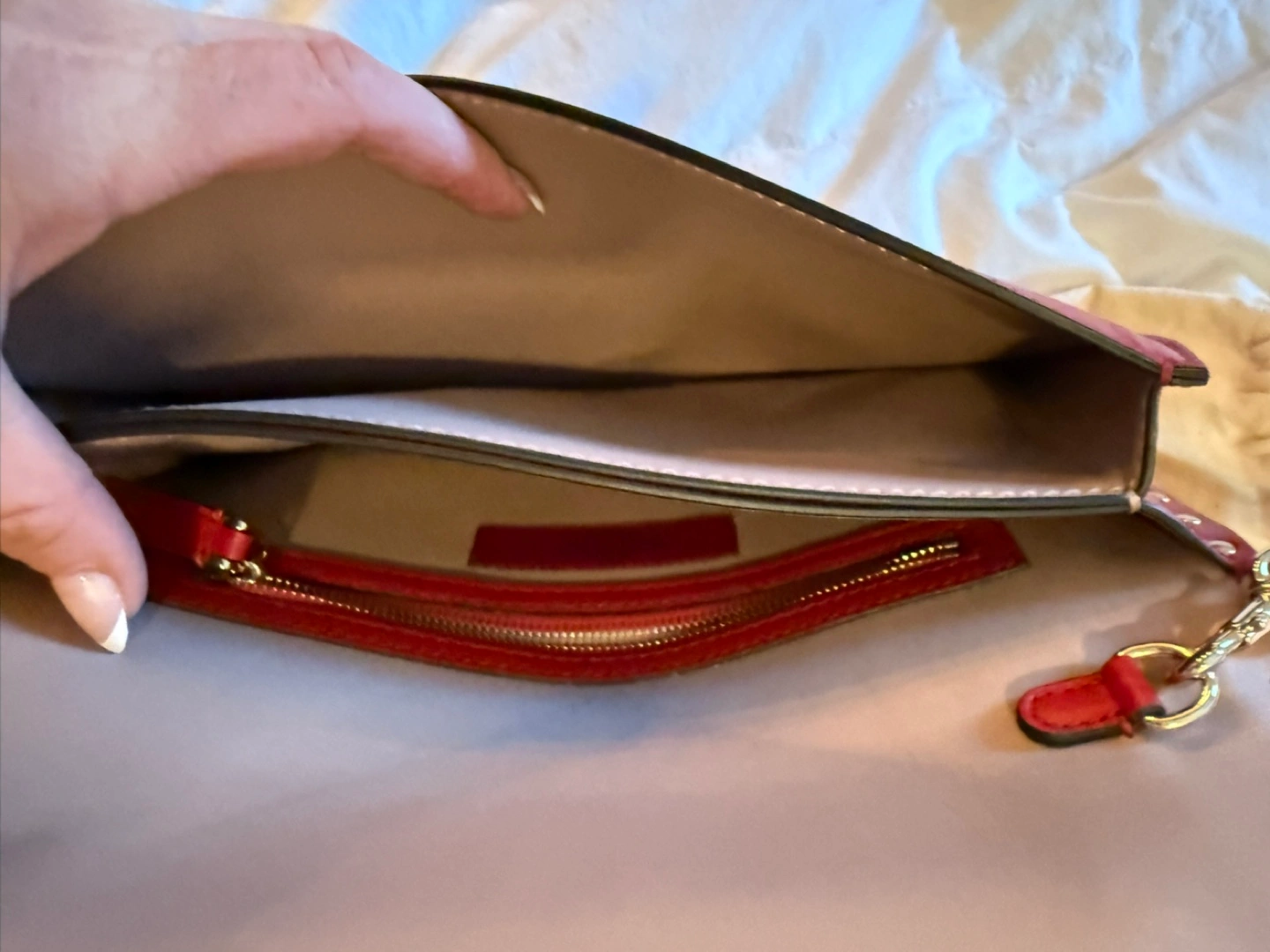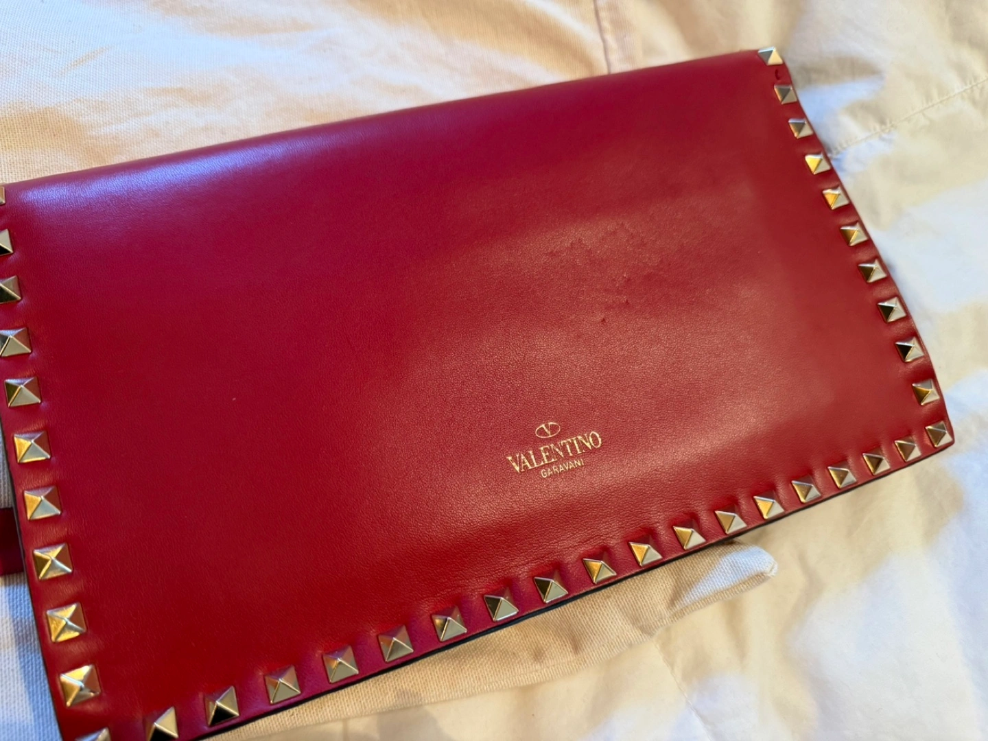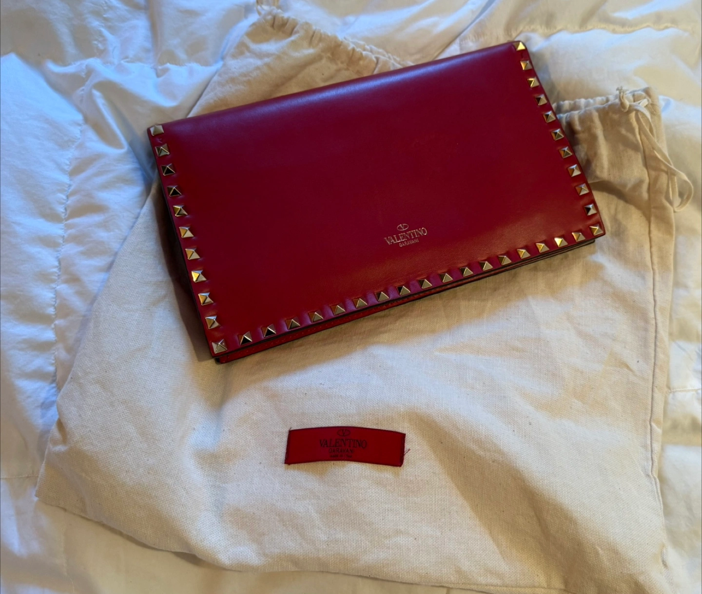 250Authentic Red leather Valentino Garavani Rockstud clutch with gold studs and a removable wrist strap. Interior features a zippered pocket. Comes with dust bag.