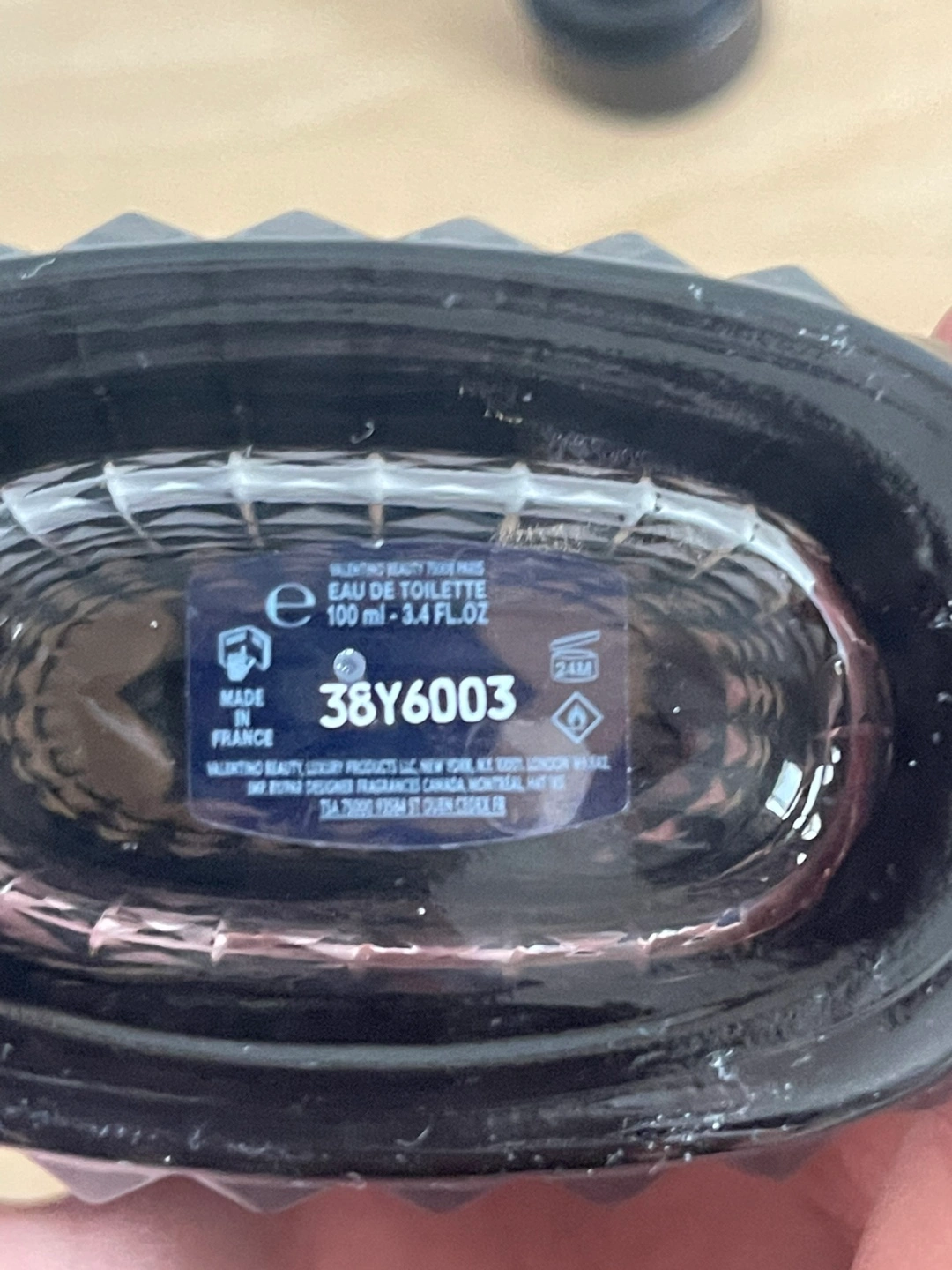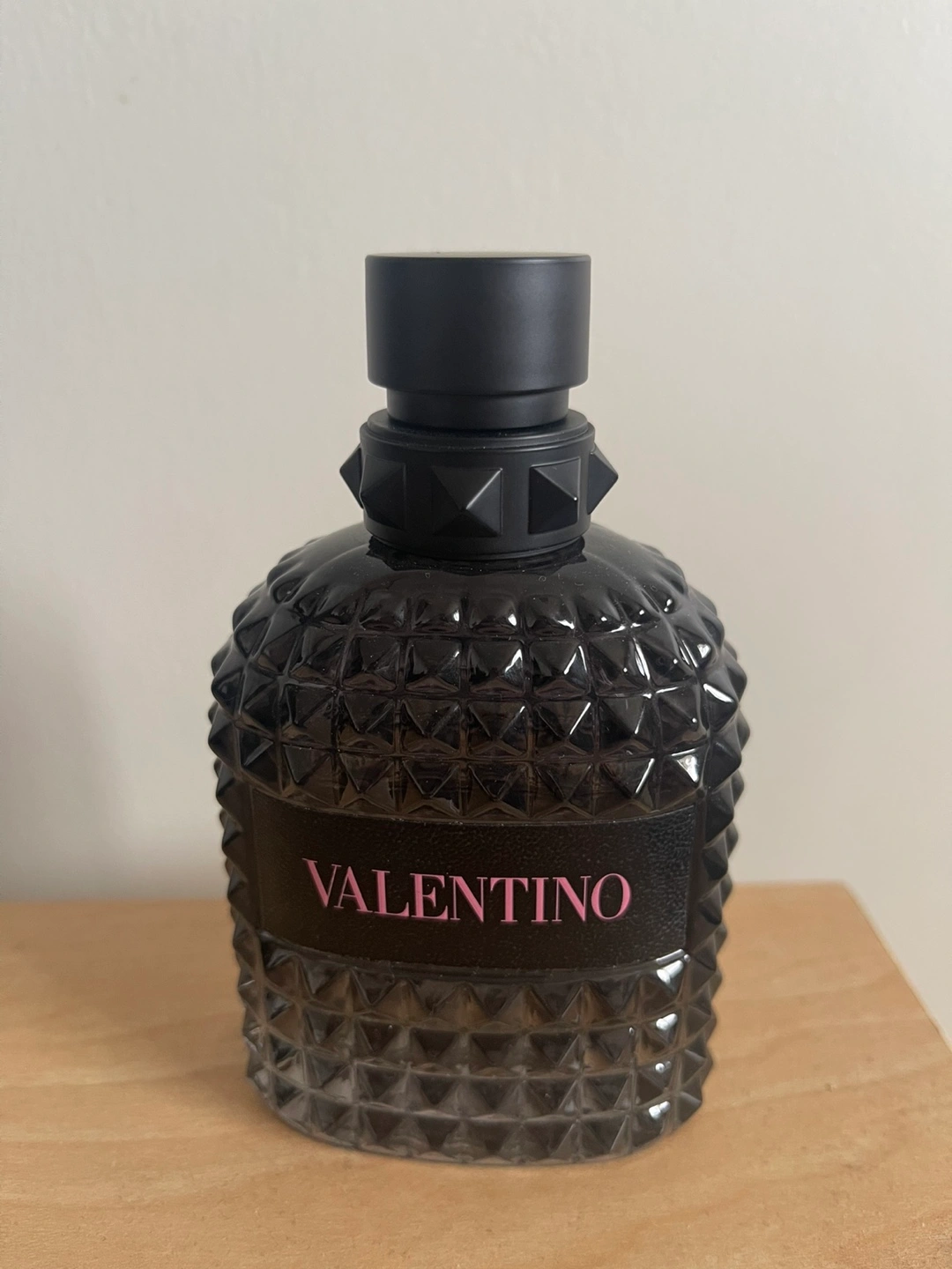 56100ml bottle of Valentino Uomo Eau de Toilette. Dark, smoky fragrance. Unique, studded bottle. Made in France. Half juice left