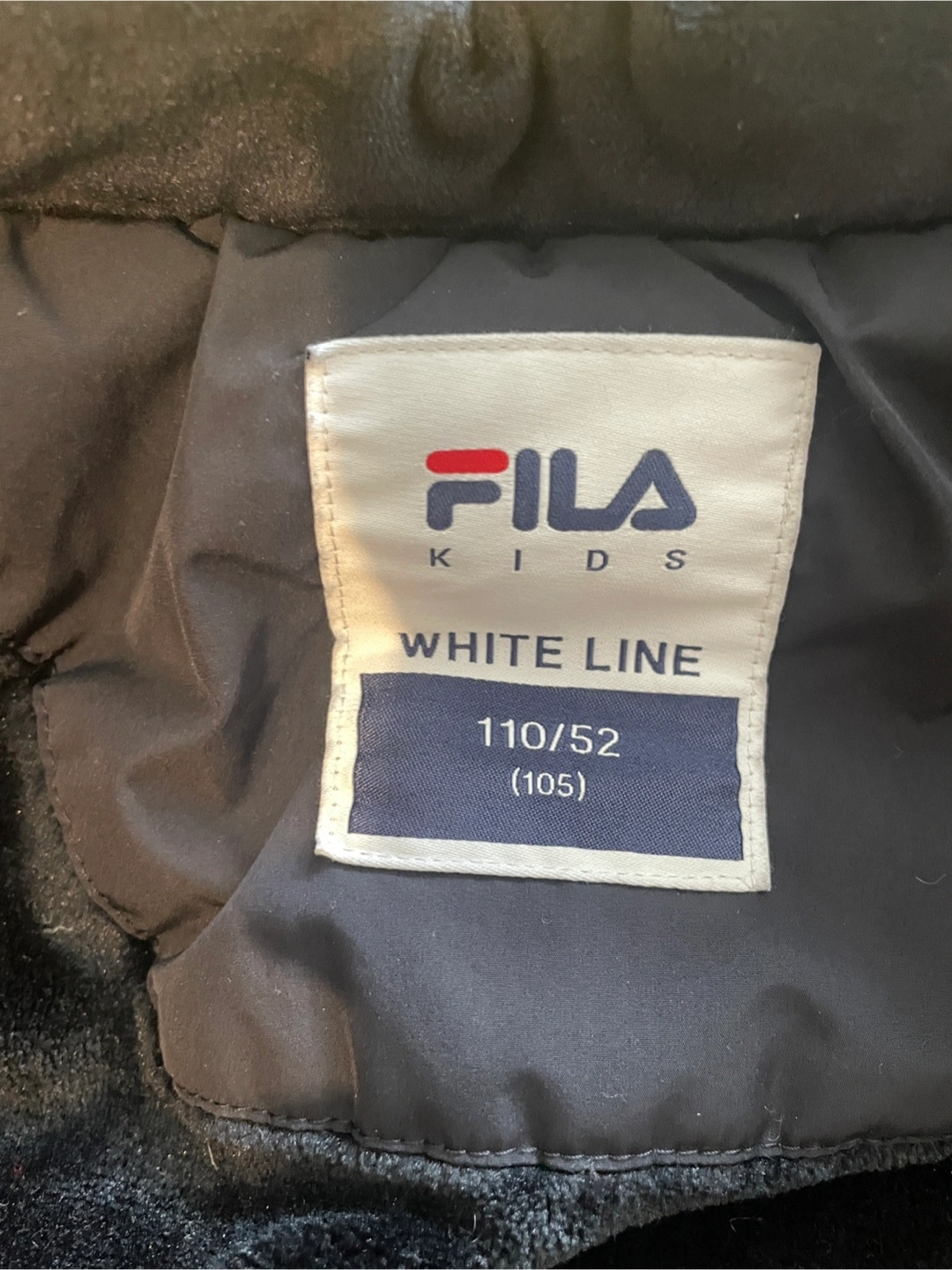 Black puffer jacket for kids by Fila. It features a bright yellow lining and the Fila logo on the front. The size is 110/52, which corresponds to a kids' size 105. It's a warm and stylish option for colder weather!
