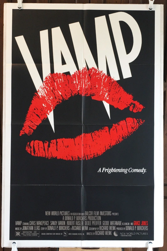 184Original One-Sheet Movie Poster for the Richard Wenk vampire monster horror comedy "Vamp" (1986), starring Chris Makepeace, Sandy Baron, Robert Rusler, Gedde Watanabe, Grace Jones, and Dedee Pfeiffer. It's 27" x 41", folded as issued. Niagara Falls pick-up.