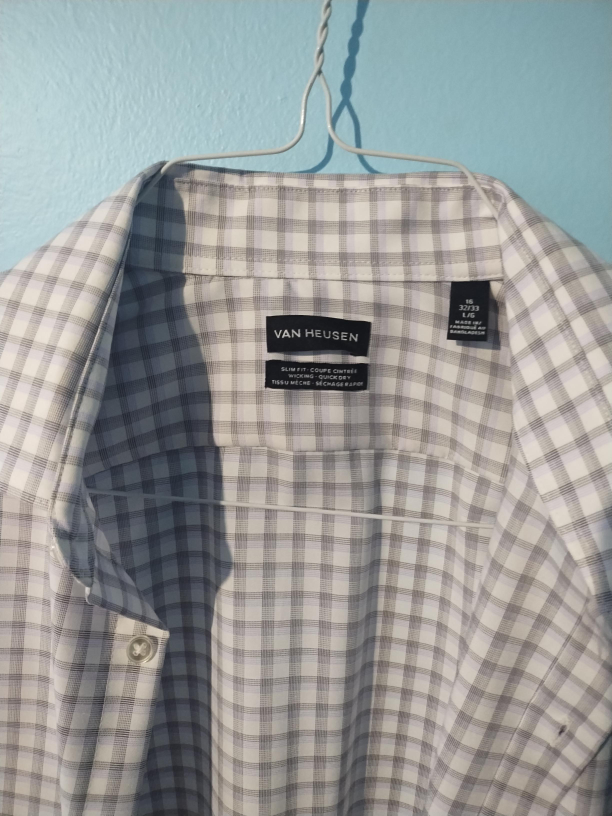 Selling a Van Heusen slim fit dress shirt in size large. It features a classic checkered pattern, perfect for any occasion!