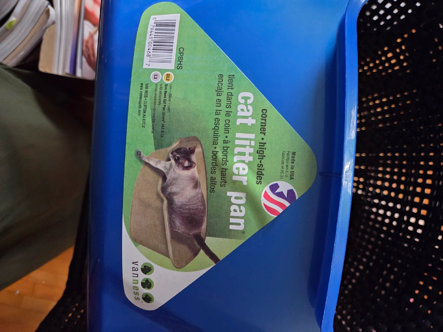 Selling a Van Ness corner cat litter pan with high sides. It's brand new, never used and ready for a new home for your furry friend! The corner design helps save space, and the high sides help contain litter