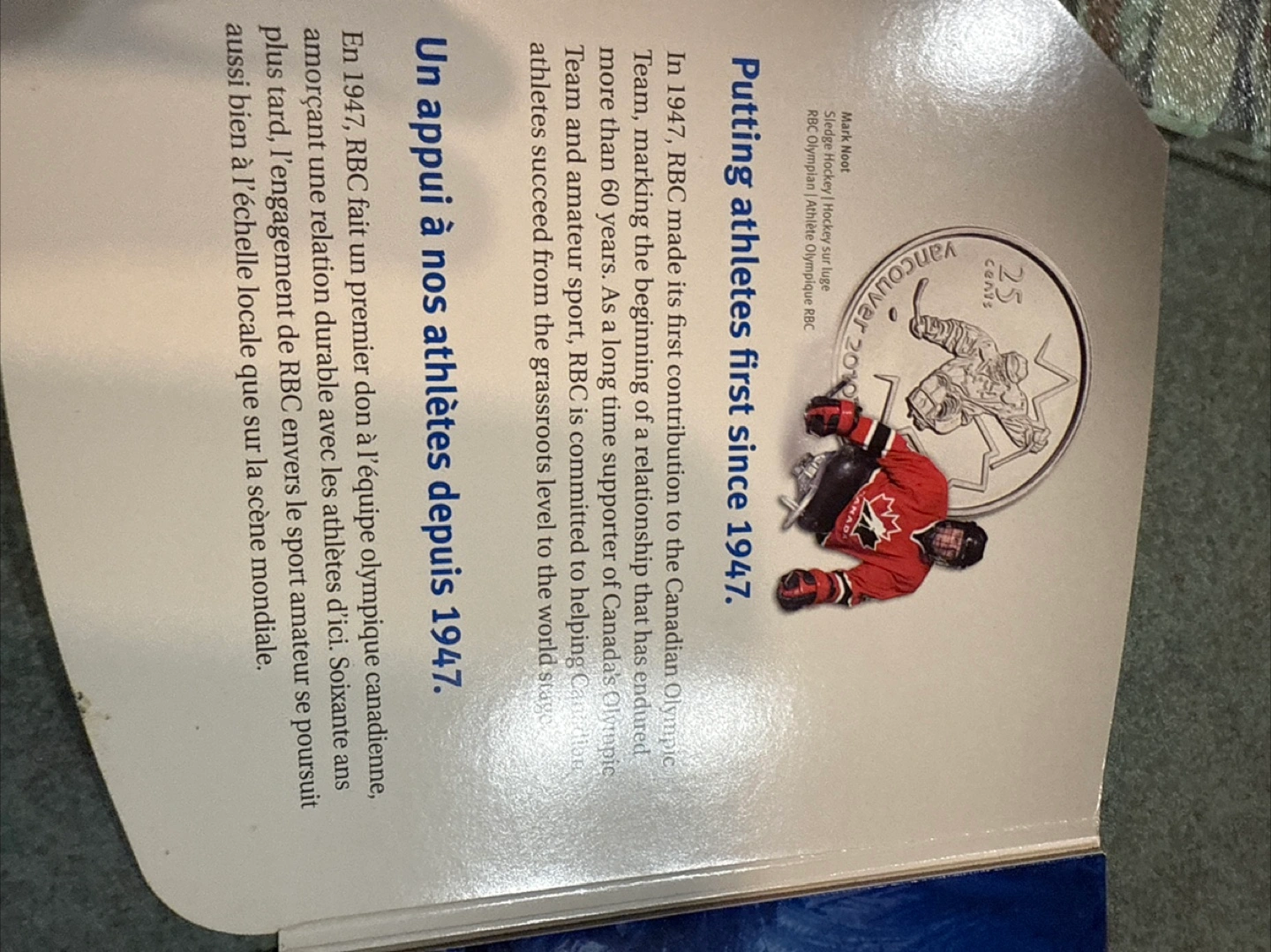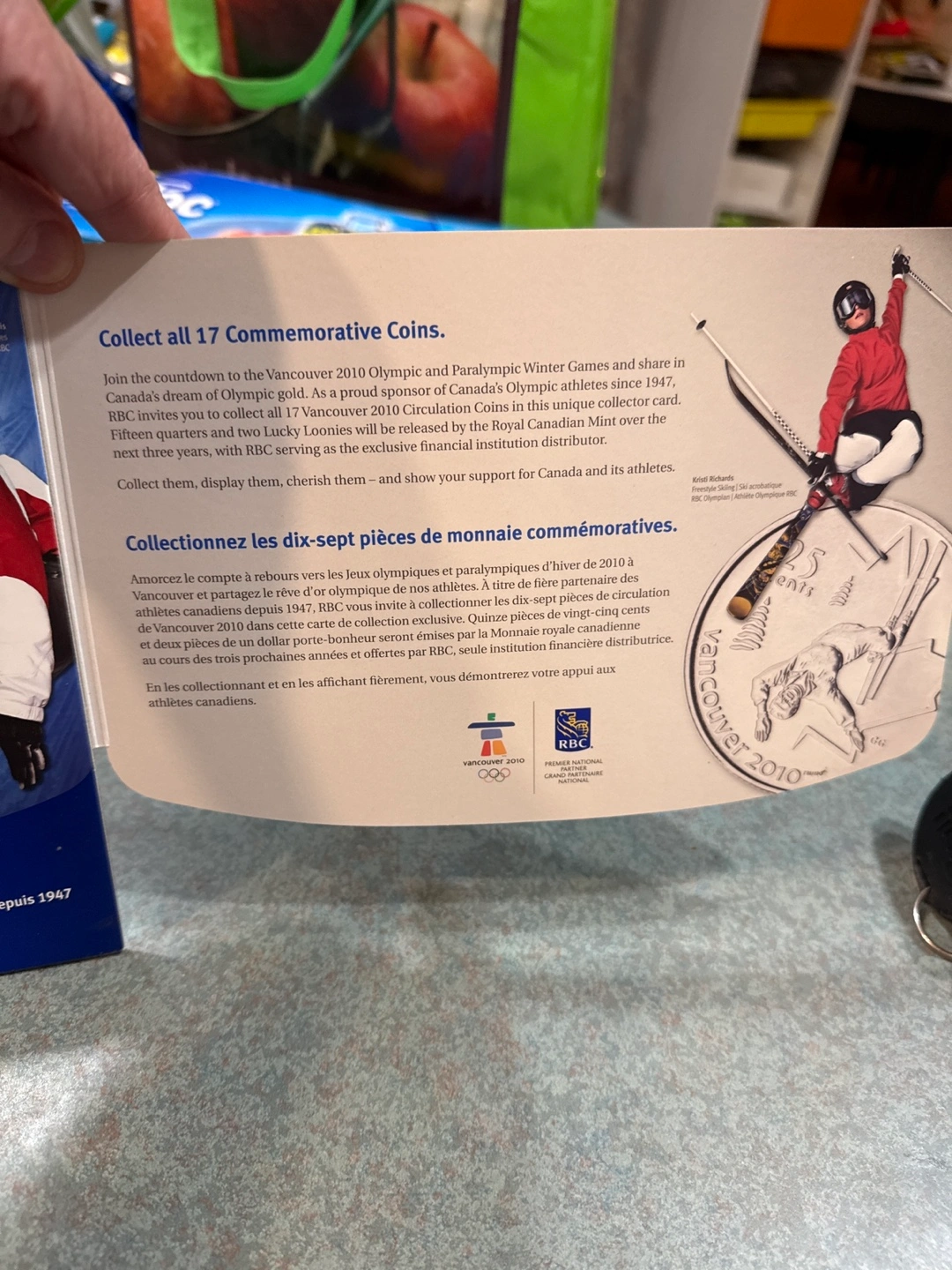 Collect all 17 Commemorative Coins from the Vancouver 2010 Olympic and Paralympic Winter Games. As a proud sponsor of Canada's Olympic athletes since 1947, RBC invites you to collect all 17 Vancouver 2010 Circulation Coins in this unique collector card. Fifteen quarters and two Lucky Loonies will be released by the Royal Canadian Mint over the next three years, with RBC serving as the exclusive financial institution distributor
