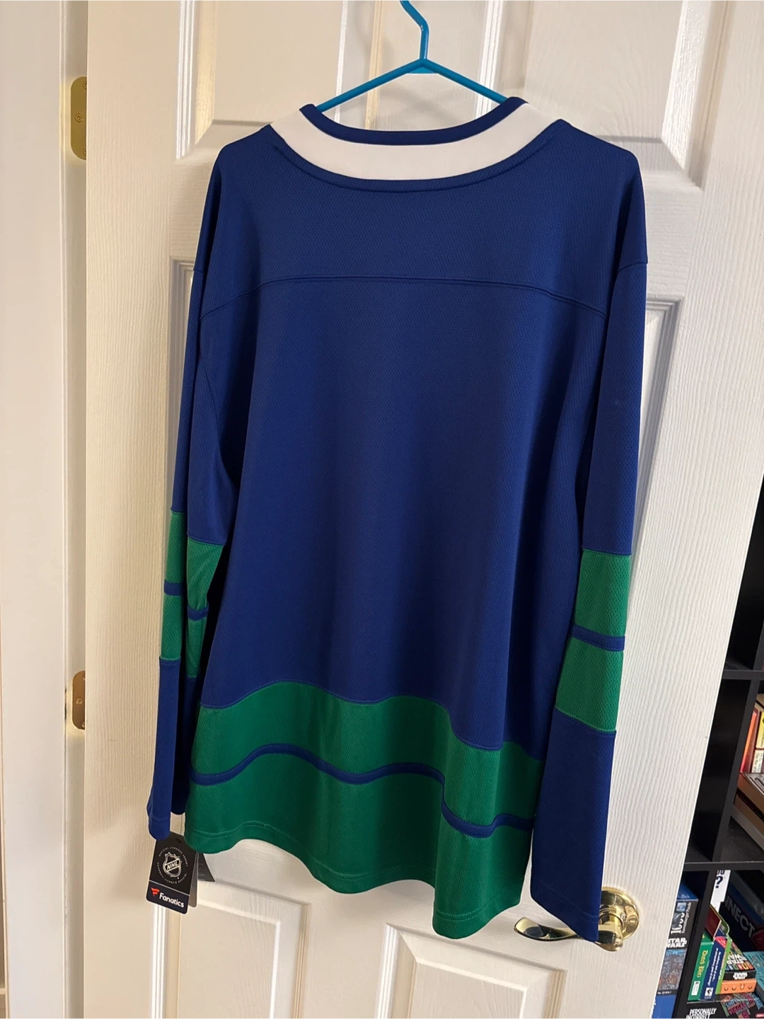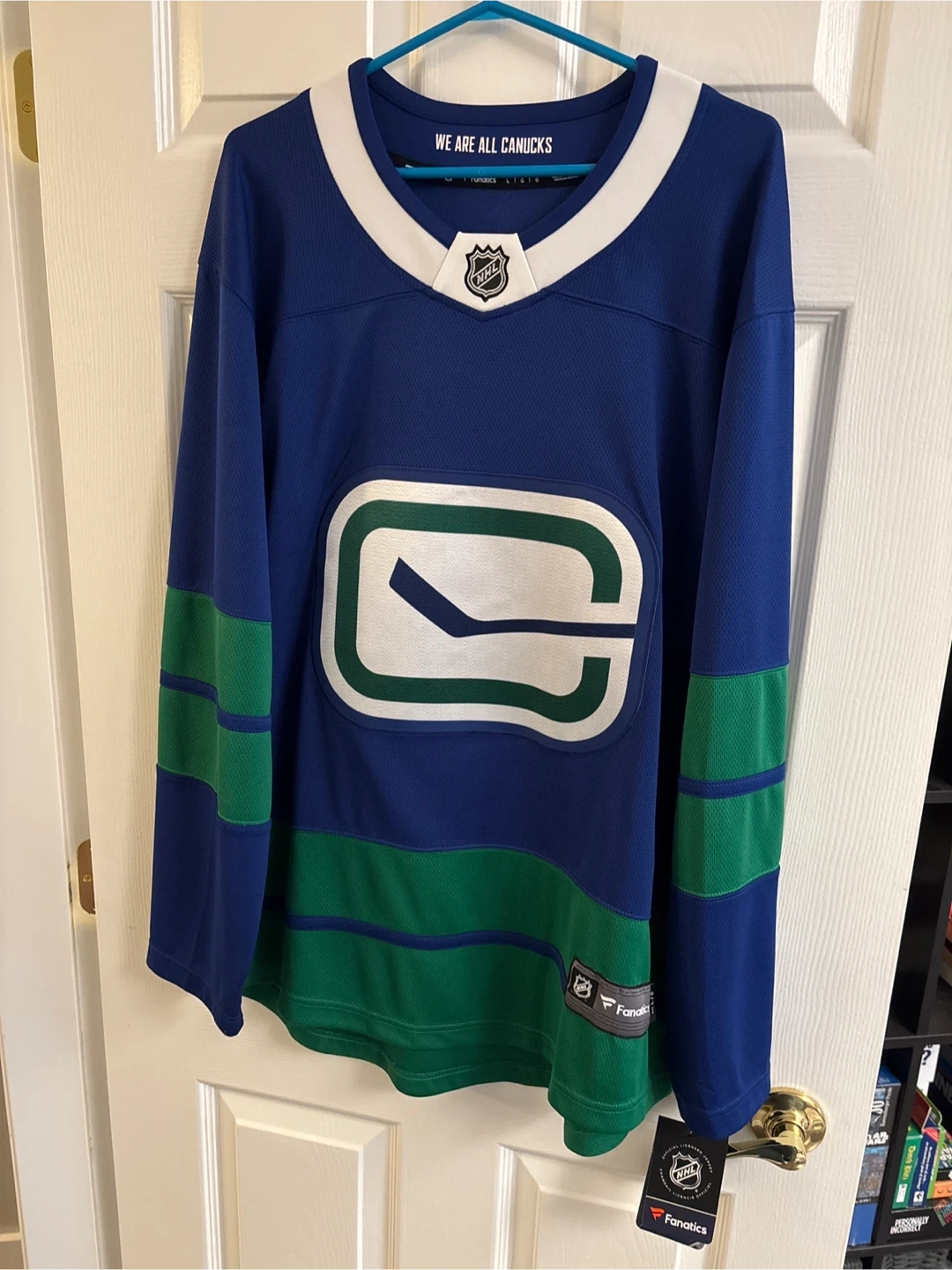 Selling a Vancouver Canucks hockey jersey from Fanatics! The jersey is blue and green with the Canucks logo on the front. Perfect for showing your team spirit