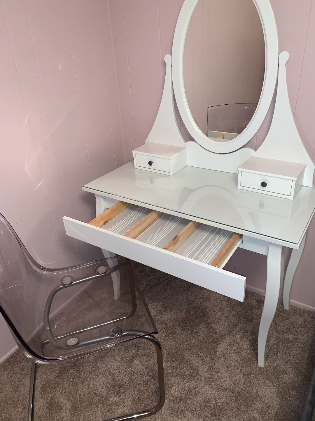 HomeBuy and sellVanity table and chairCathyWestwood600 reviewsSoldVanity table and chairFurniture · $150IKEA SET - solid white vanity with drawers and mirror. Sturdy construction. Comes with classy clear acrylic chair, also sturdy and look beautiful together. Can deliver if in area. ConditionGoodWhere to meetWestwood0 chats