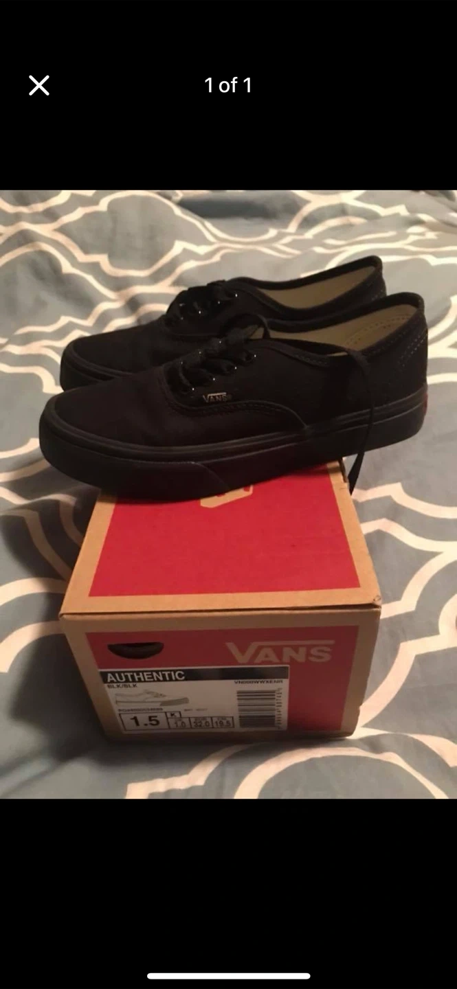 Selling a pair of kids Vans Authentic shoes in black! They're in great shape and come with the original box. The size is 1.5 in US/Canada sizing, perfect for little feet!