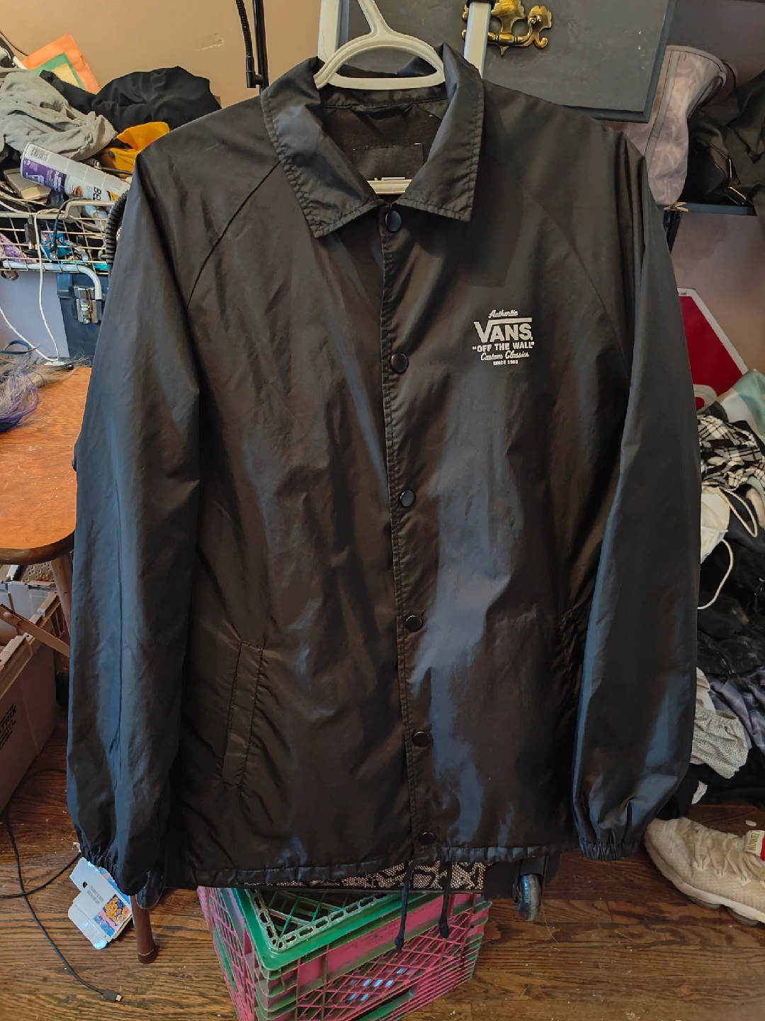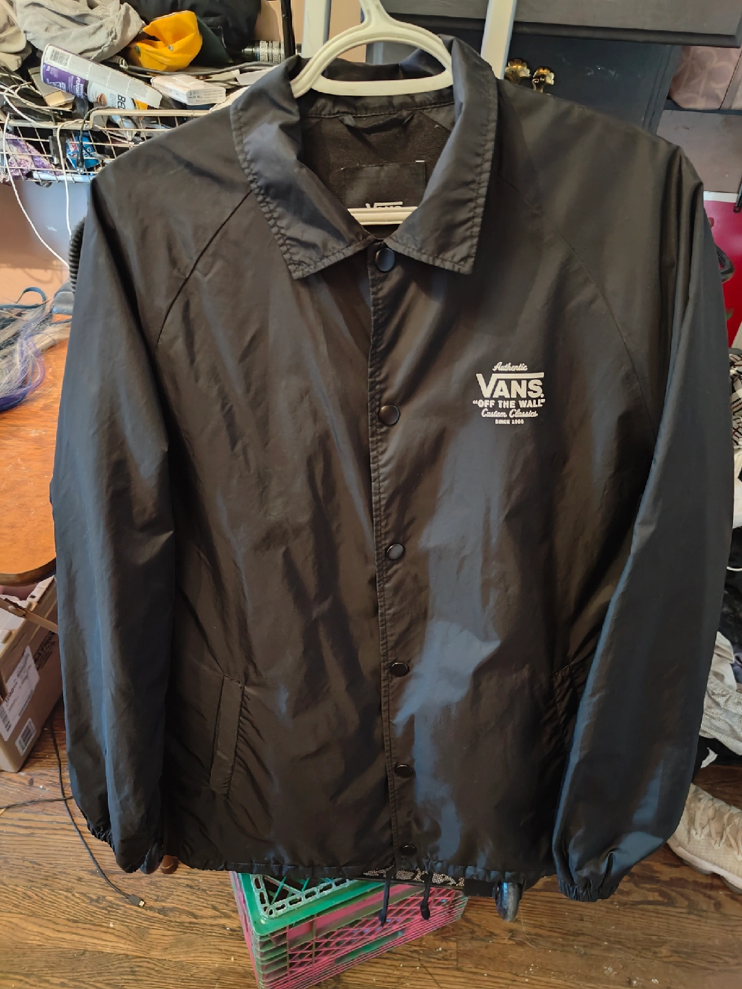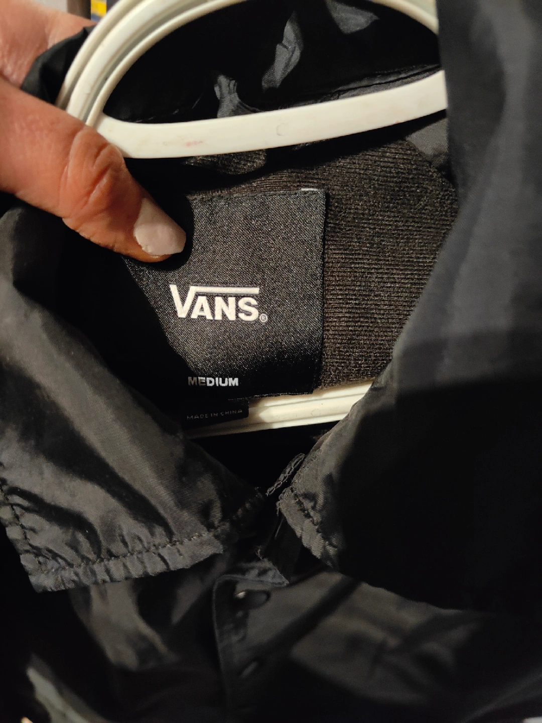 Selling a classic black Vans coaches jacket in size medium! It's in great shape and ready for a new home. The jacket features the iconic Vans "Off The Wall" logo on the chest. Perfect for layering or wearing on its own during those cooler days. Feel free to reach out if you have any questions!
