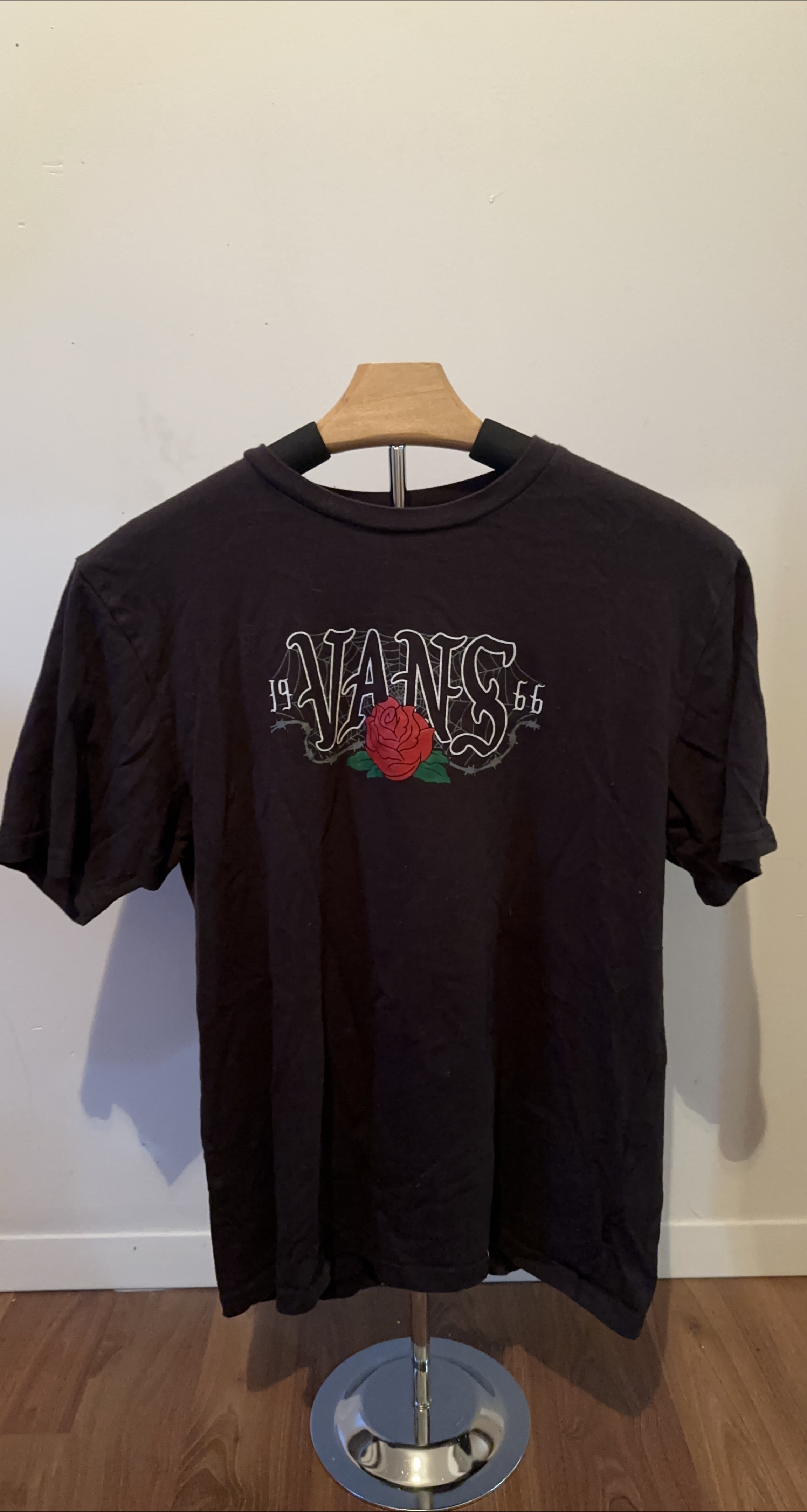 Selling a black Vans t-shirt with a cool rose graphic on the front. It's in great condition and ready for a new home!