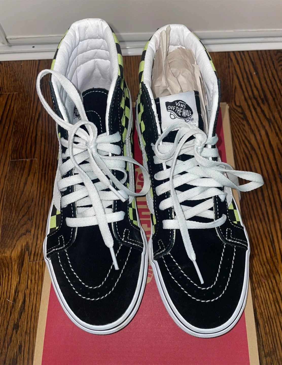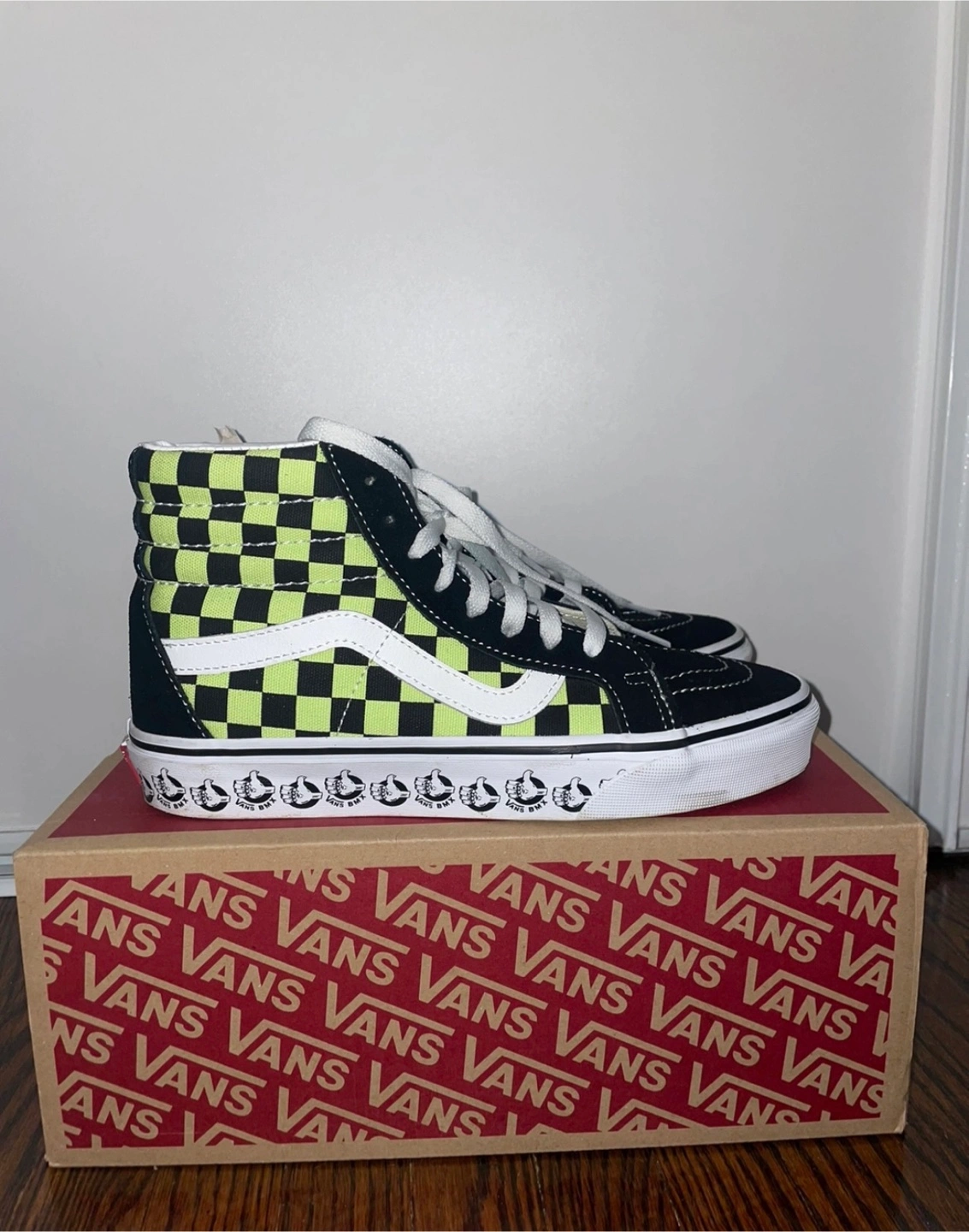 24Black and neon green checkerboard pattern. High-top design. White laces. Comes in original box.