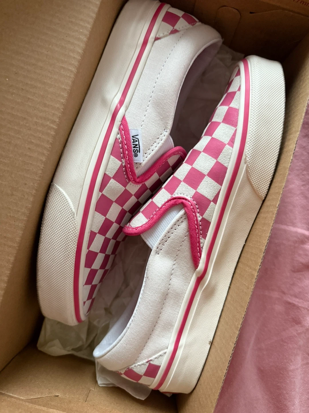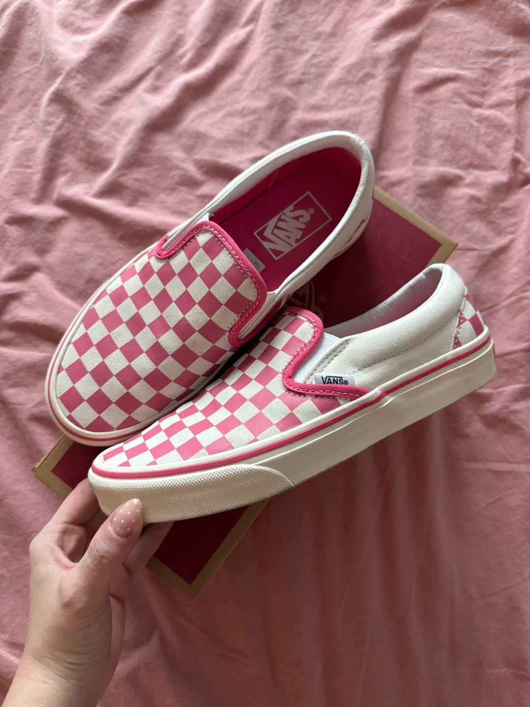 15Selling a pair of Vans Classic Slip-On shoes in a fun pink and white checkerboard pattern! They are a US size 6 and come with the original box