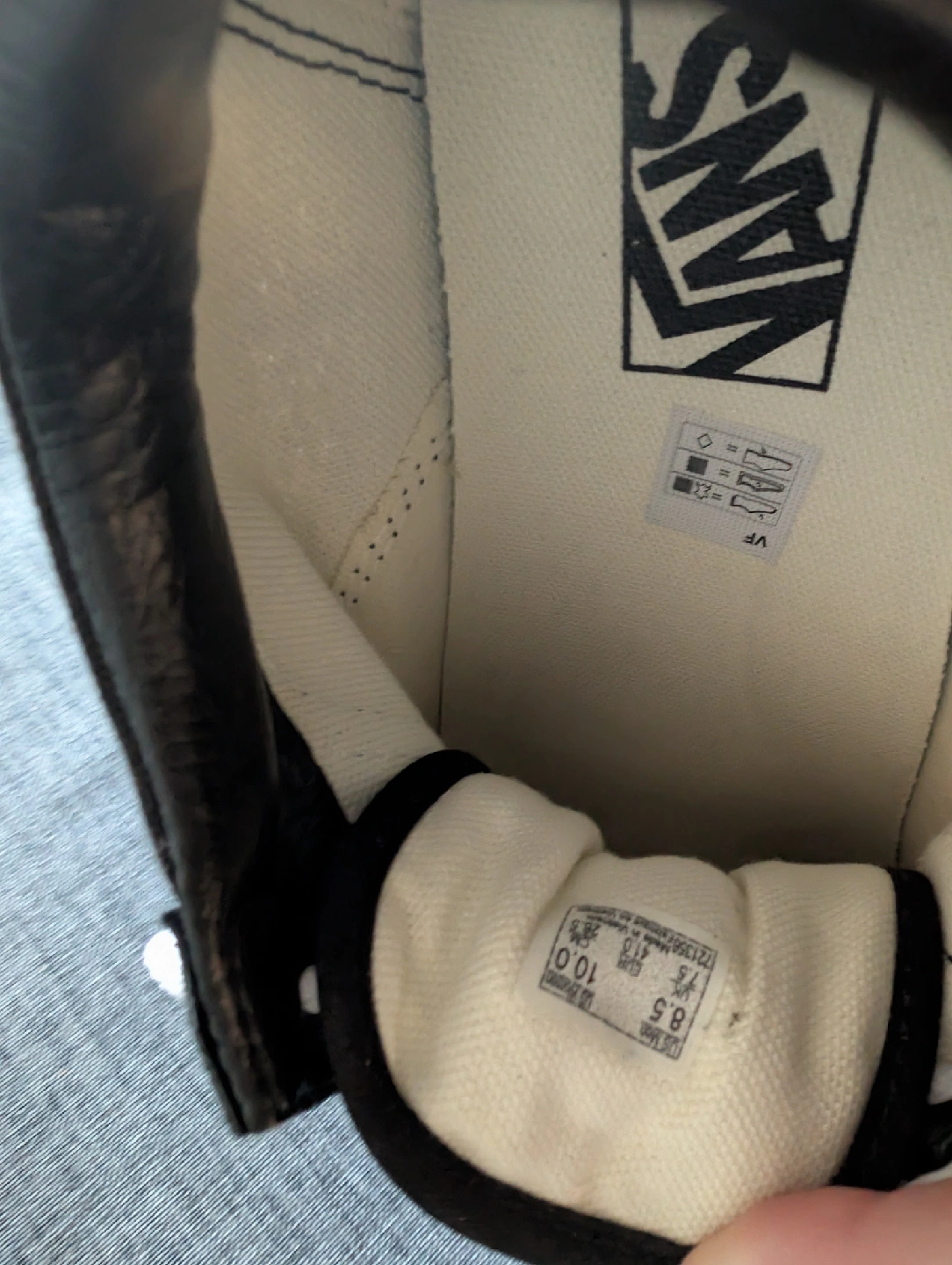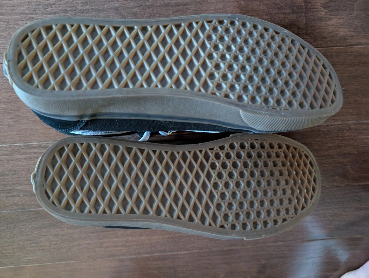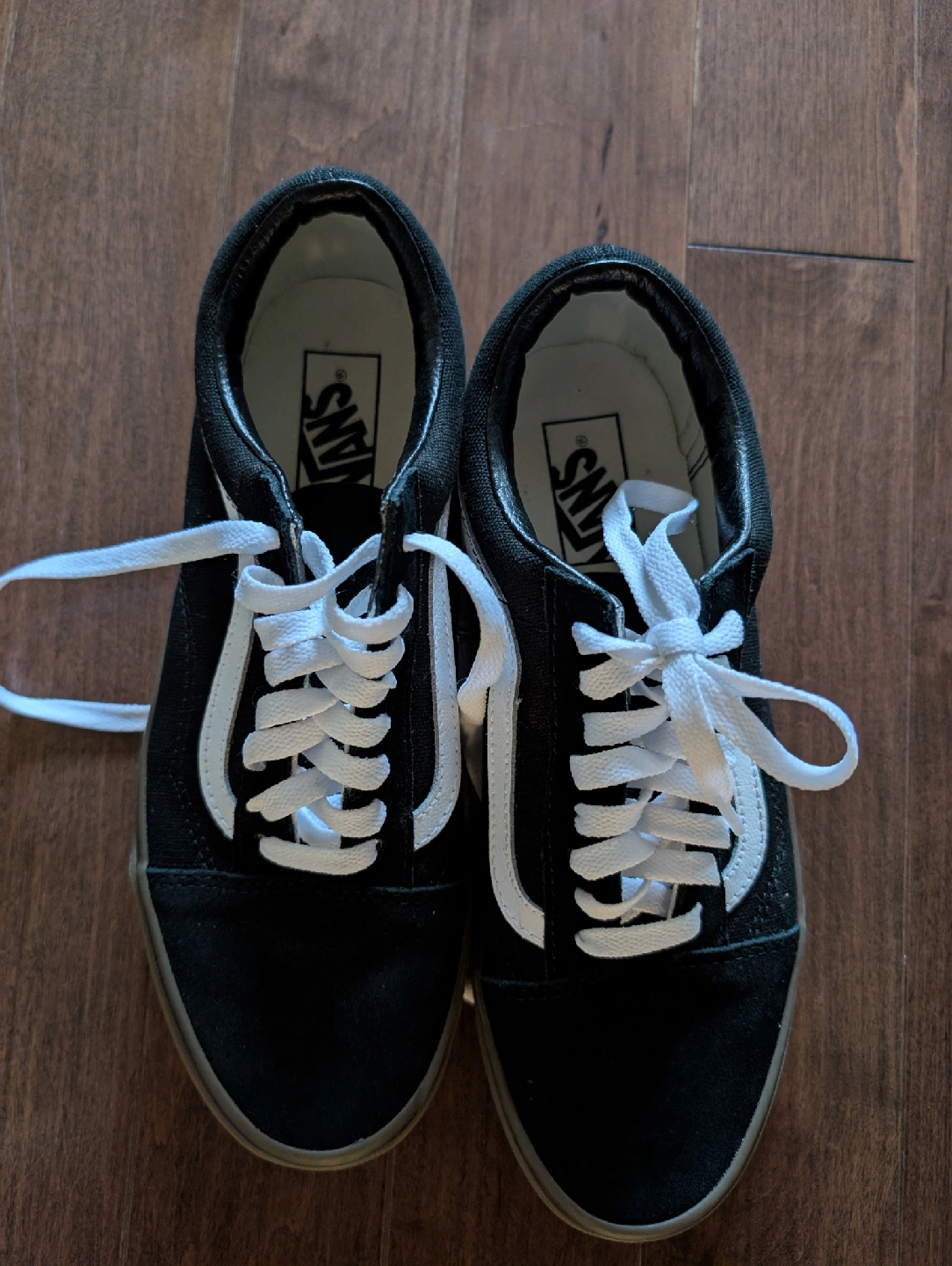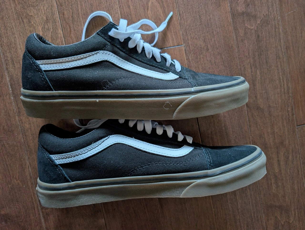 Selling a pair of classic Vans Old Skool sneakers in black with gum soles. They're in great shape as they were only worn once briefly. The size is 8.5 US Men's.