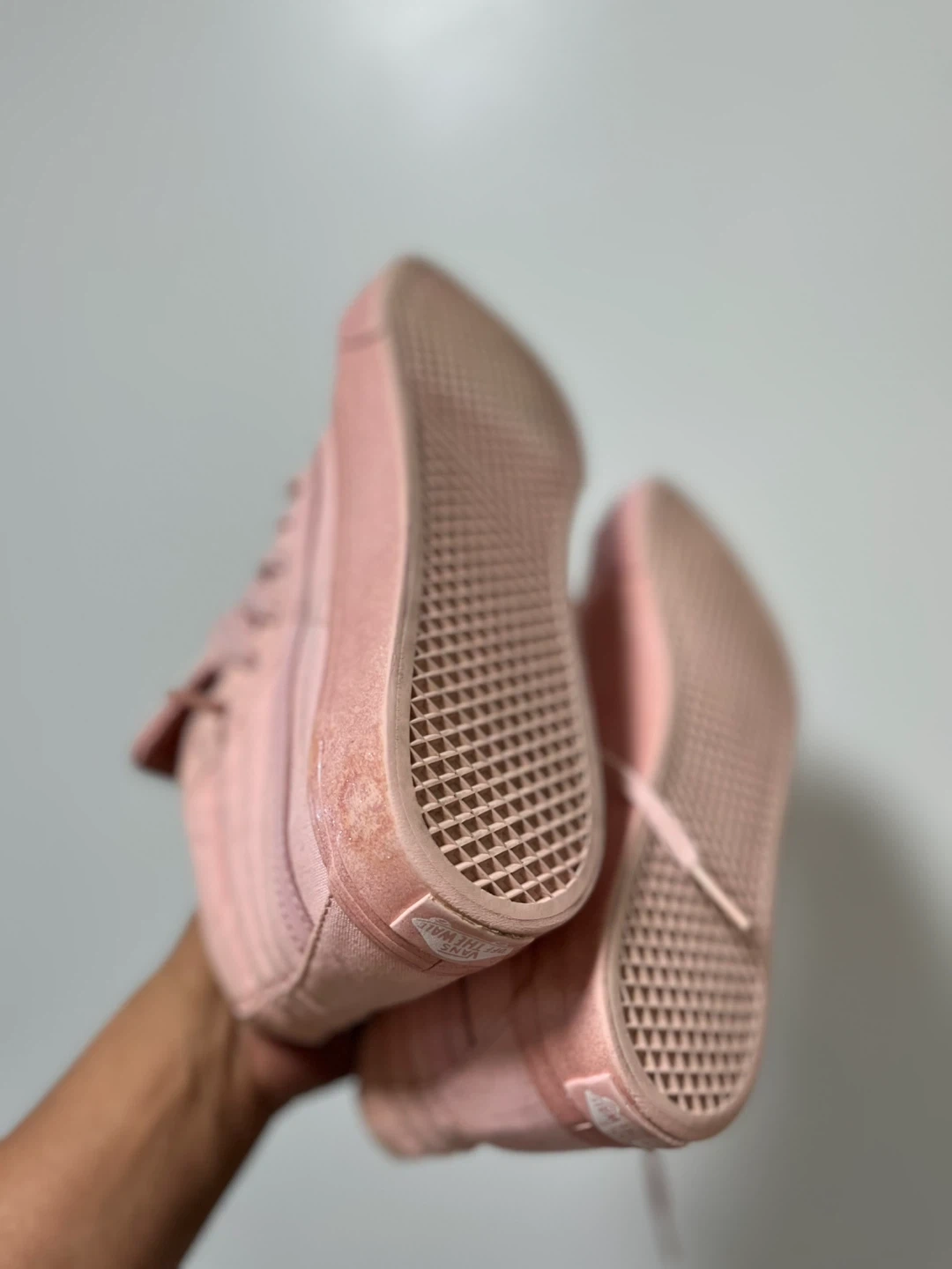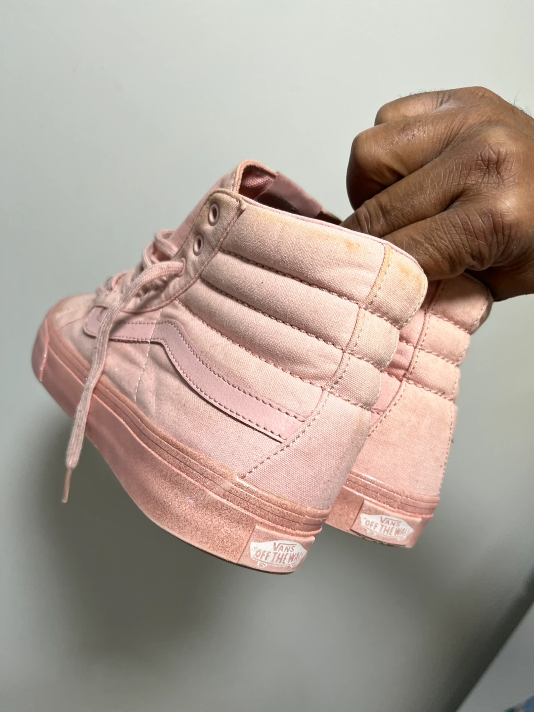 81Selling a pair of Vans Sk8-Hi high-top sneakers in pink canvas. They're in good used condition, perfect for adding a pop of colour to your outfit! The classic Vans style is always a great choice.