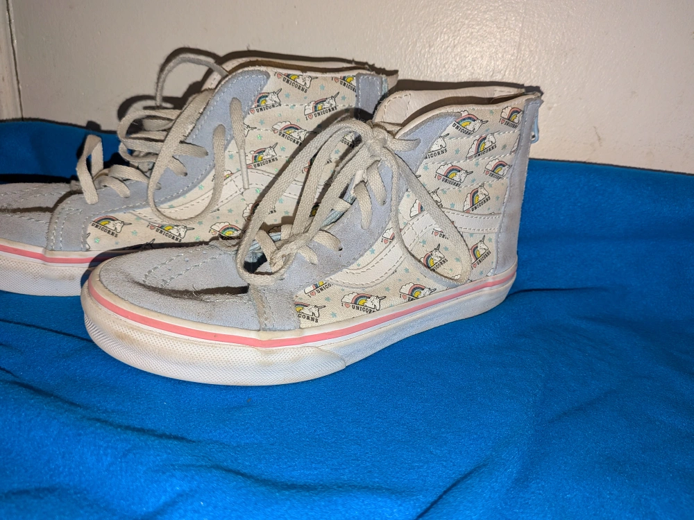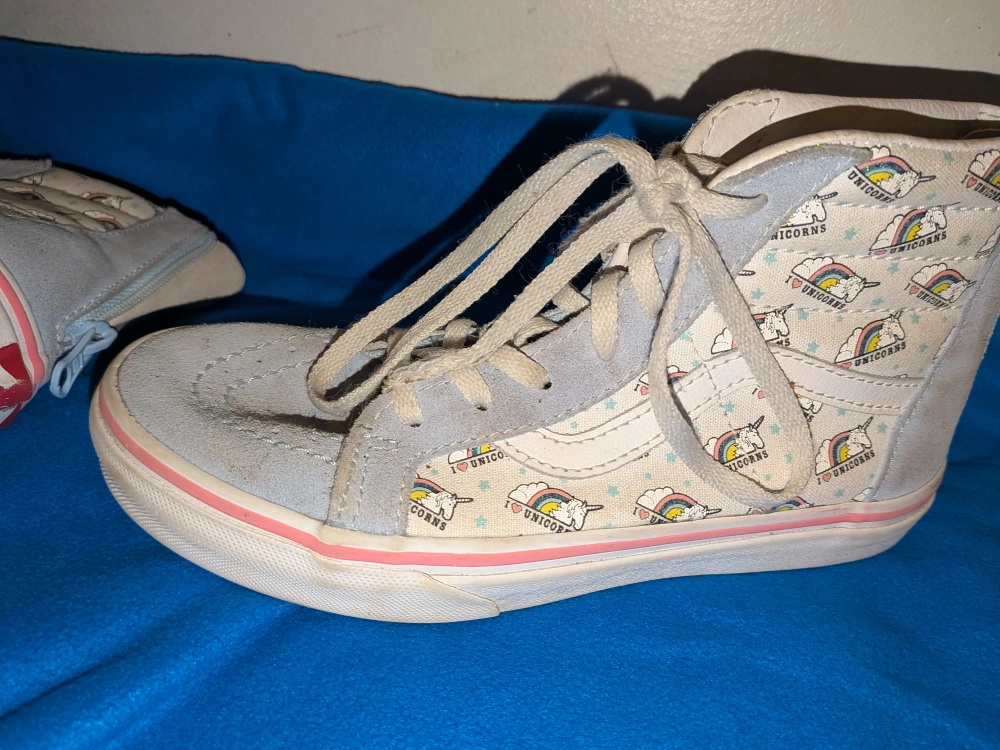 10Selling a pair of Vans Sk8-Hi sneakers with a cute unicorn pattern! They're a light blue colour and show some signs of wear, but still have lots of life left in them. Perfect for a kiddo who loves unicorns!
