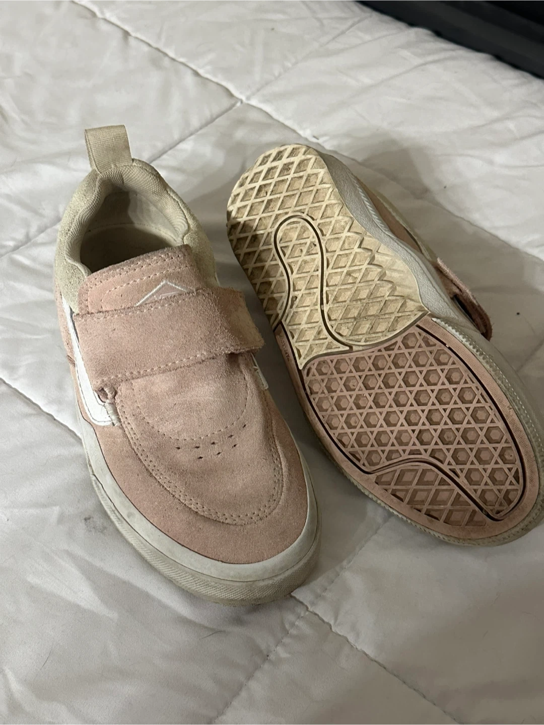 5Selling a pair of pink suede Vans slip-on skate shoes. They have a velcro strap and are in used condition.