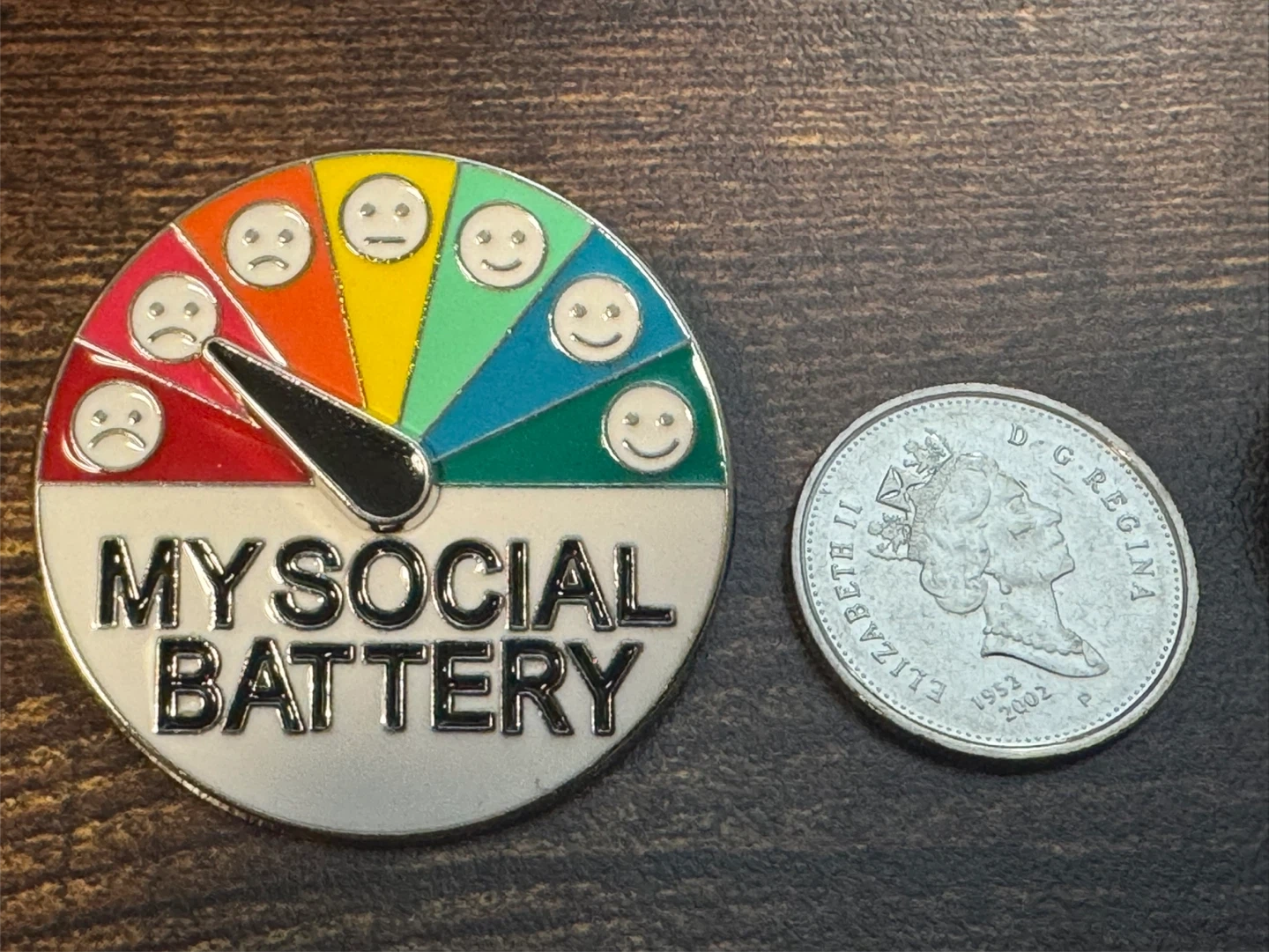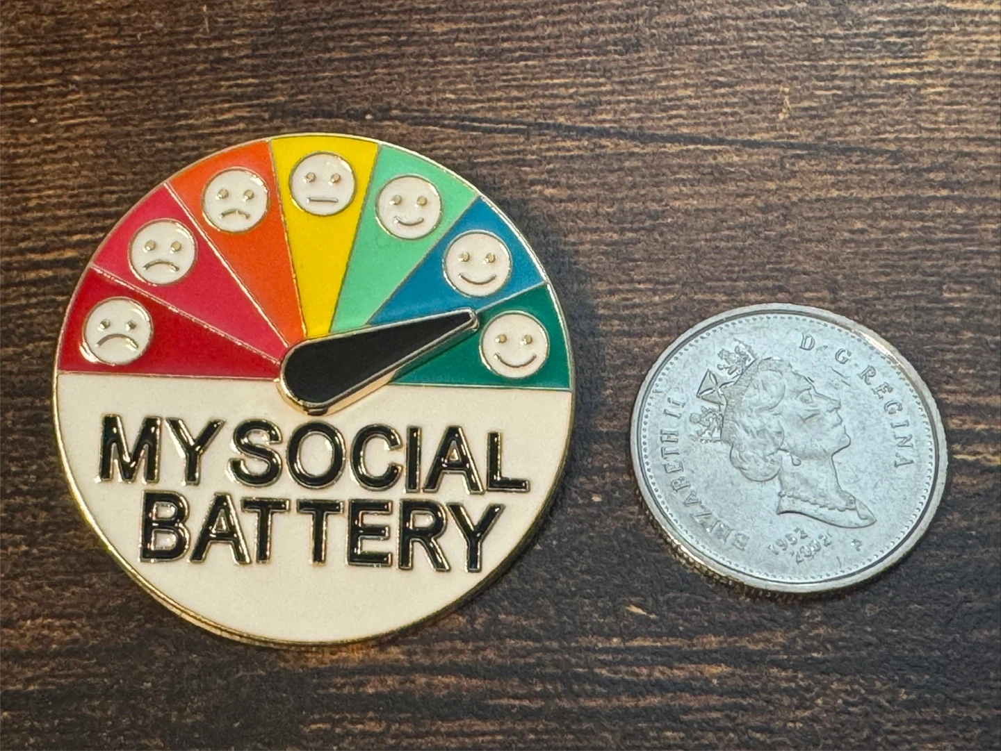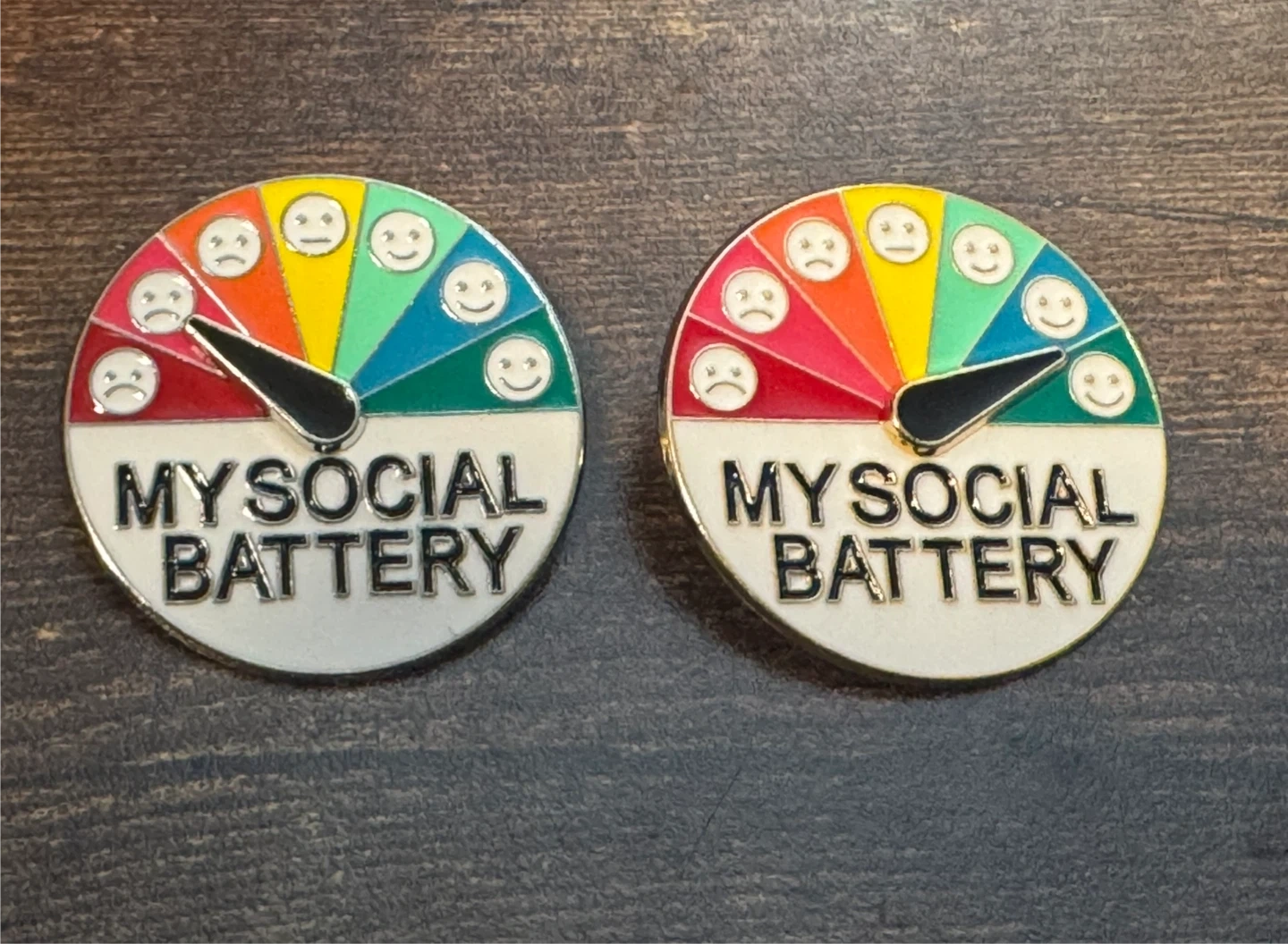 Two pieces of enamel pins featuring a "My Social Battery" gauge.