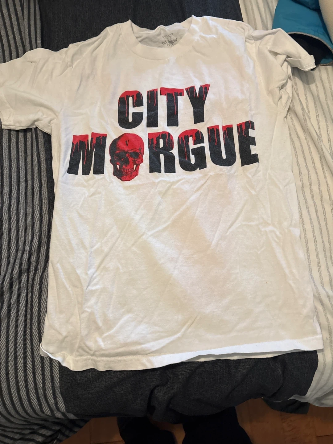 Selling a Vlone City Morgue t-shirt in white. It features a skull design on the front and the signature Vlone 'V' on the back. A cool piece for fans of the brand and the music group